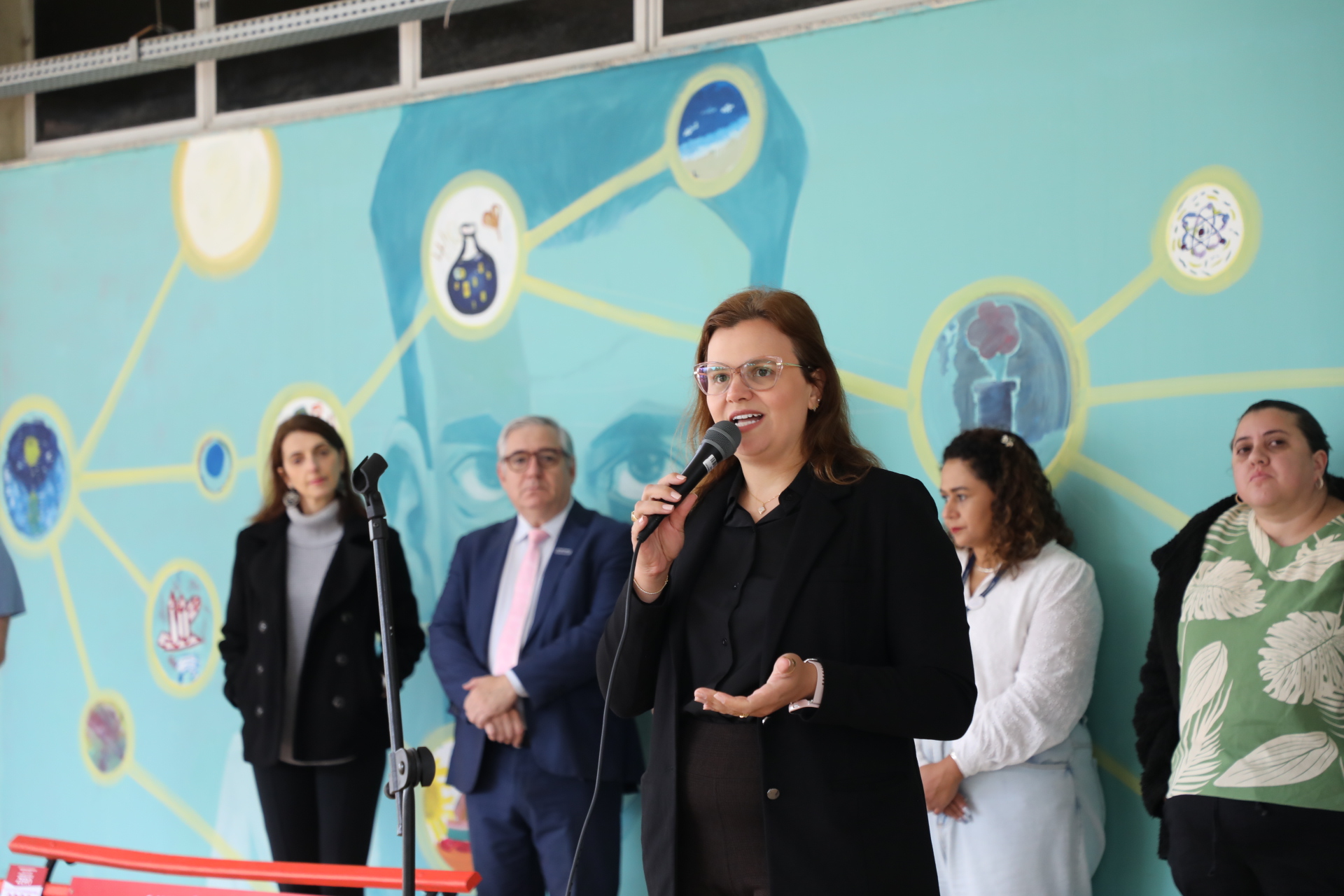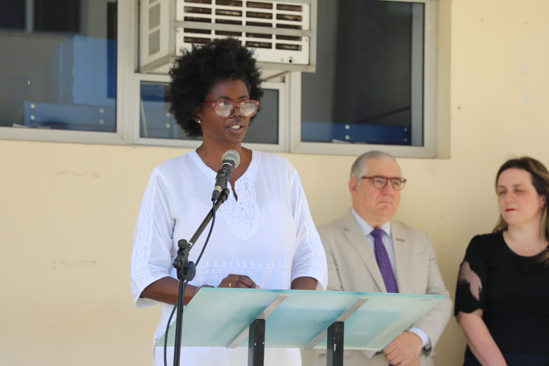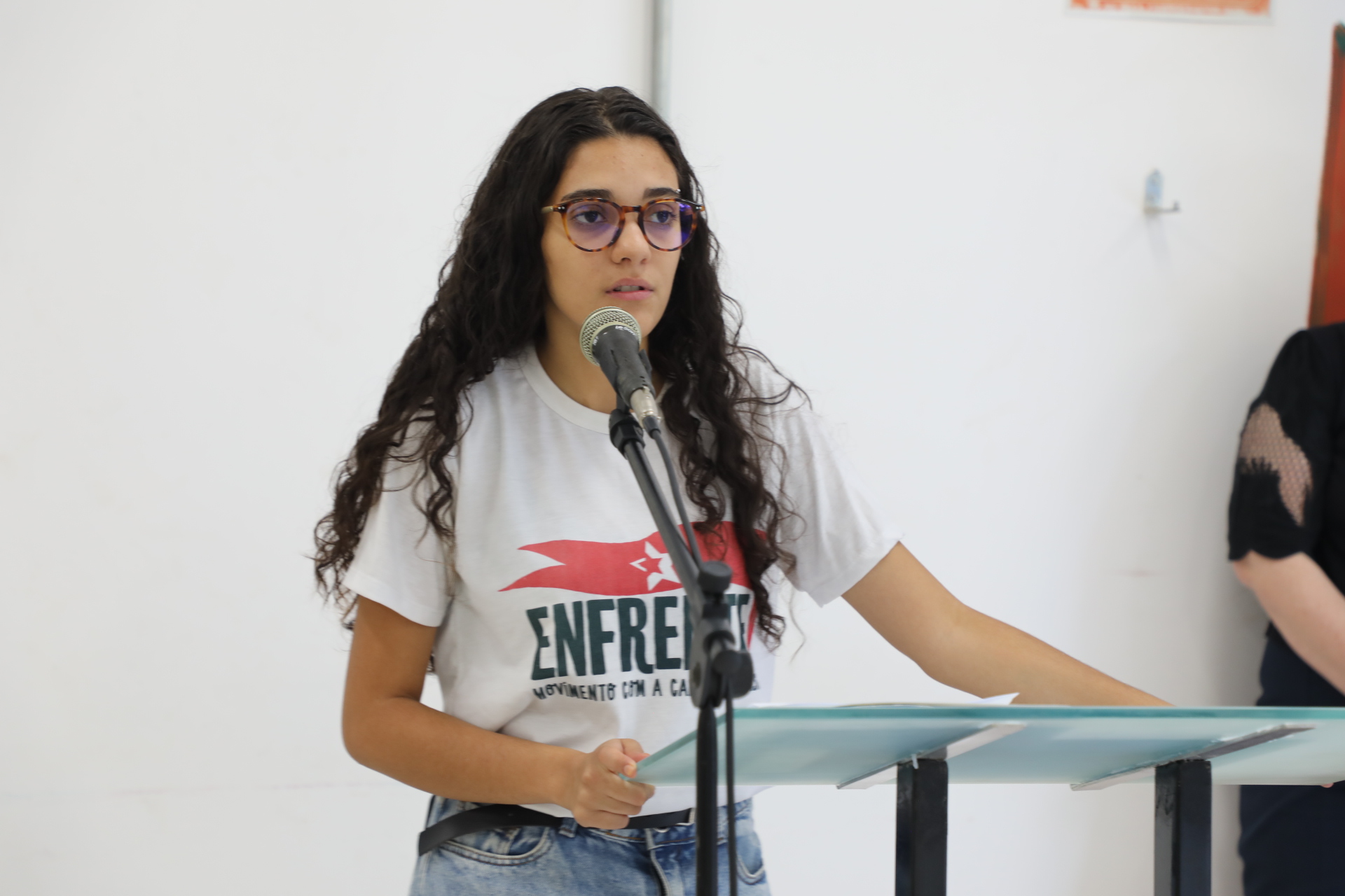 “Um lugar seguro para as mulheres permite que as mulheres permaneçam na Universidade. A violência é institucional, ela é hierárquica, ela tem cor, ela tem gênero. Hoje, como mulher aqui sentada e como representante dos alunos, além de agradecer a visibilidade e movimentos como esse do banco vermelho, eu peço também para que cada um aqui seja vigilante junto com a gente, mulheres, não só as mulheres, mas todos os alunos do campus.”