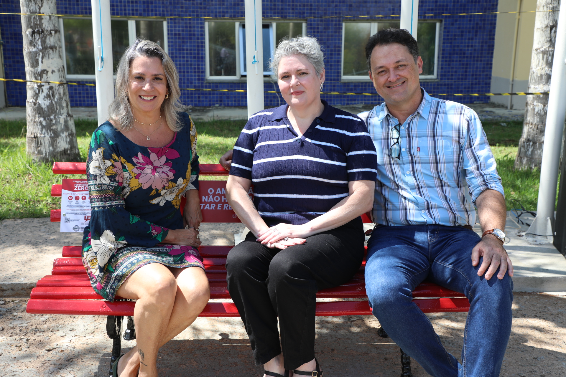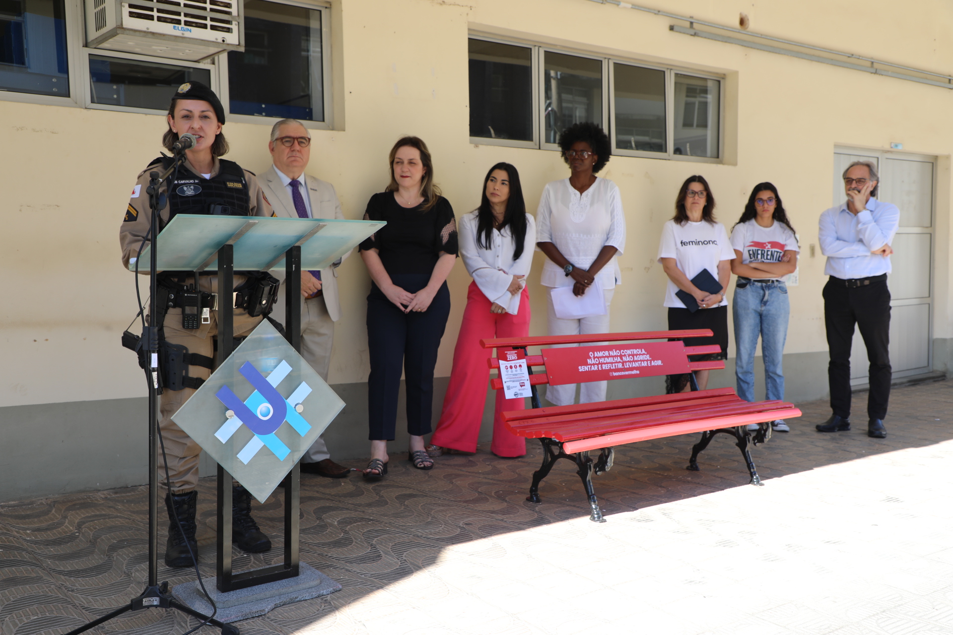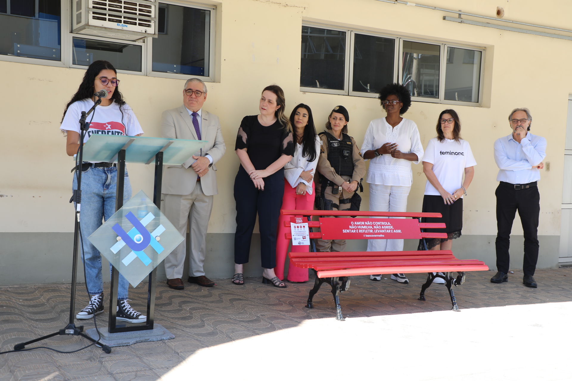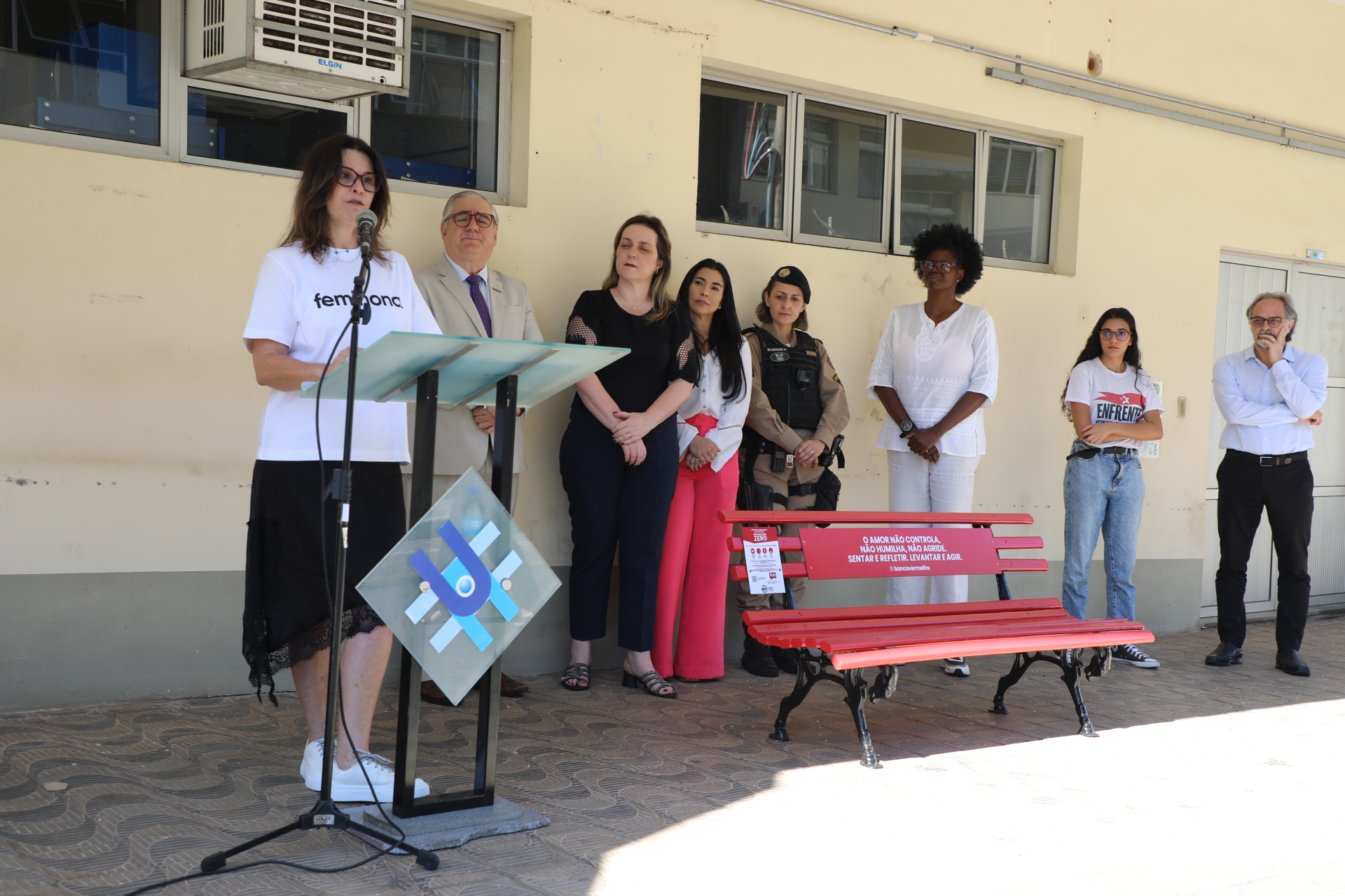 “Para mim não é um prazer inaugurar esse banco. Por eu ser mulher, com direito à liberdade, de ser feliz, de viver plenamente. Porém, com um propósito dedicado à luta pelo feminicídio zero no Brasil, tenho um olhar de luta e esperança de vitória. Eu espero que um dia esse banco esteja pintado de flores, de alegria, não mais vermelho”, salientou.