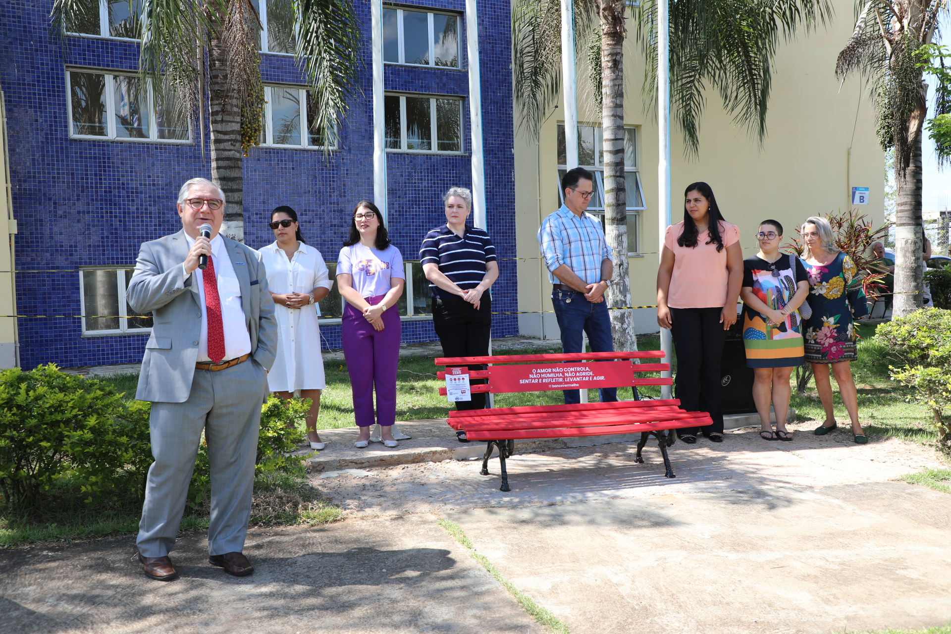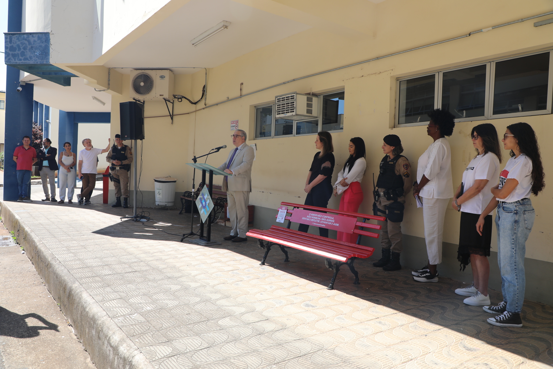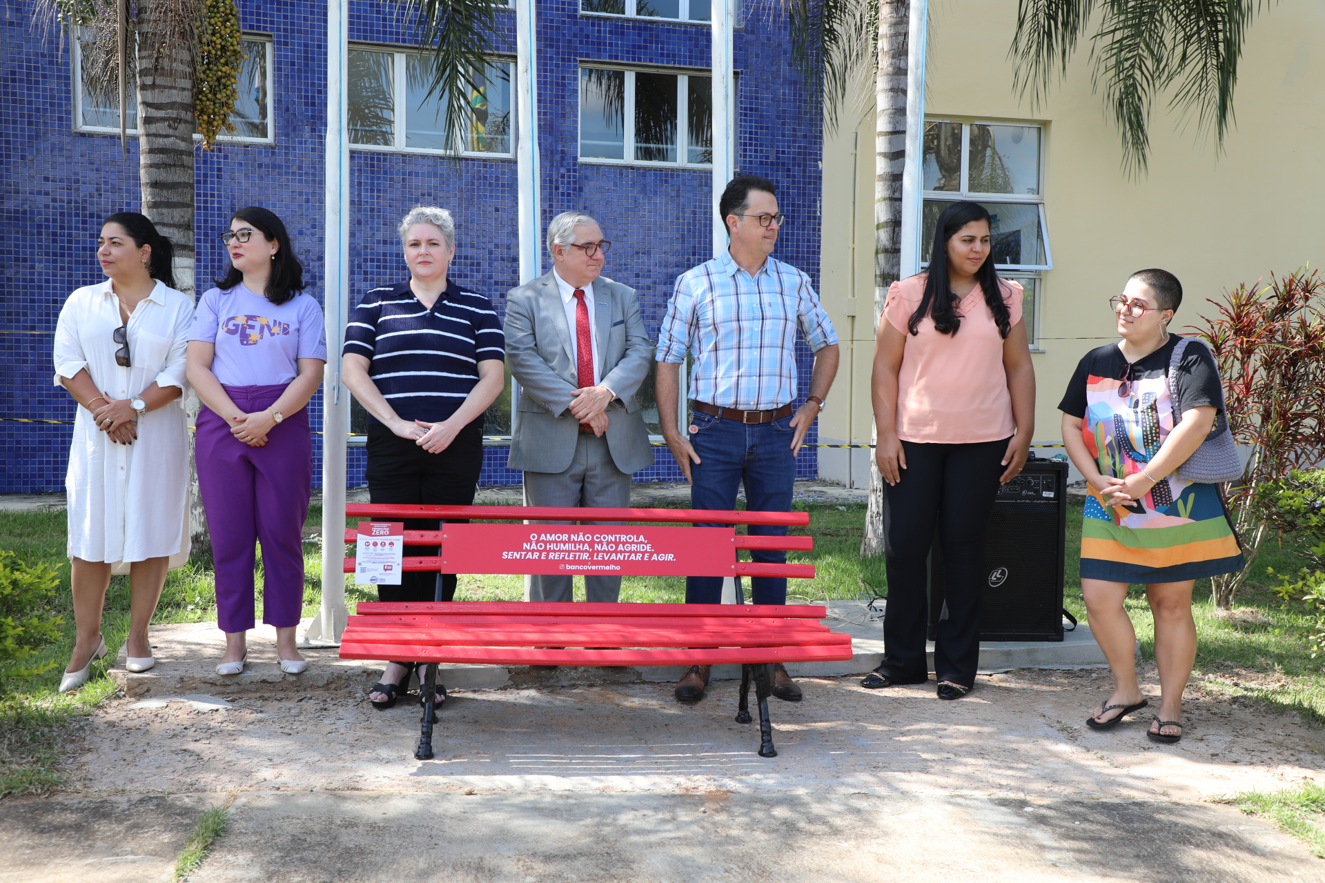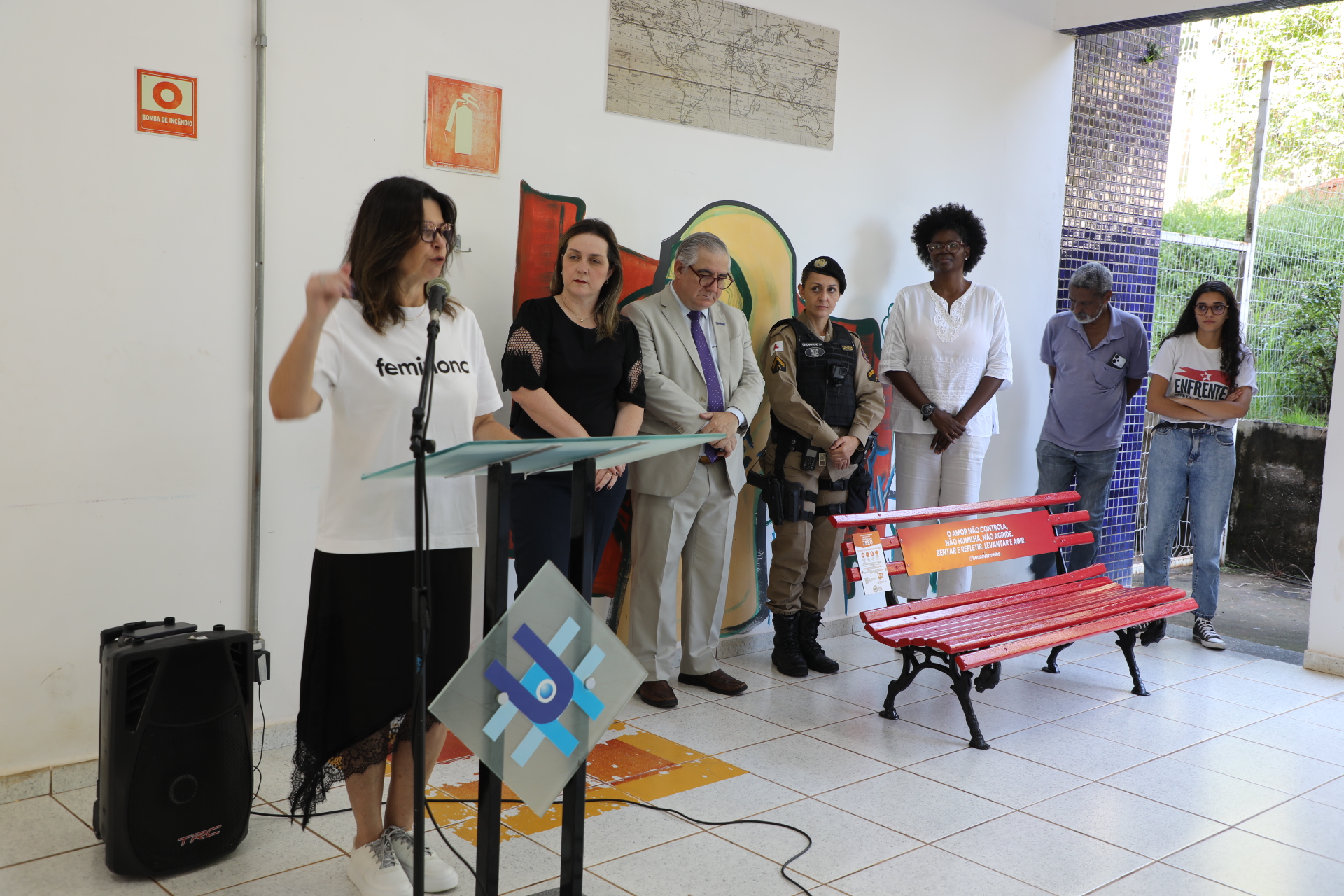 “Para mim não é um prazer inaugurar esse banco. Por eu ser mulher, com direito à liberdade, de ser feliz, de viver plenamente. Porém, com um propósito dedicado à luta pelo feminicídio zero no Brasil, tenho um olhar de luta e esperança de vitória. Eu espero que um dia esse banco esteja pintado de flores, de alegria, não mais vermelho”, salientou.