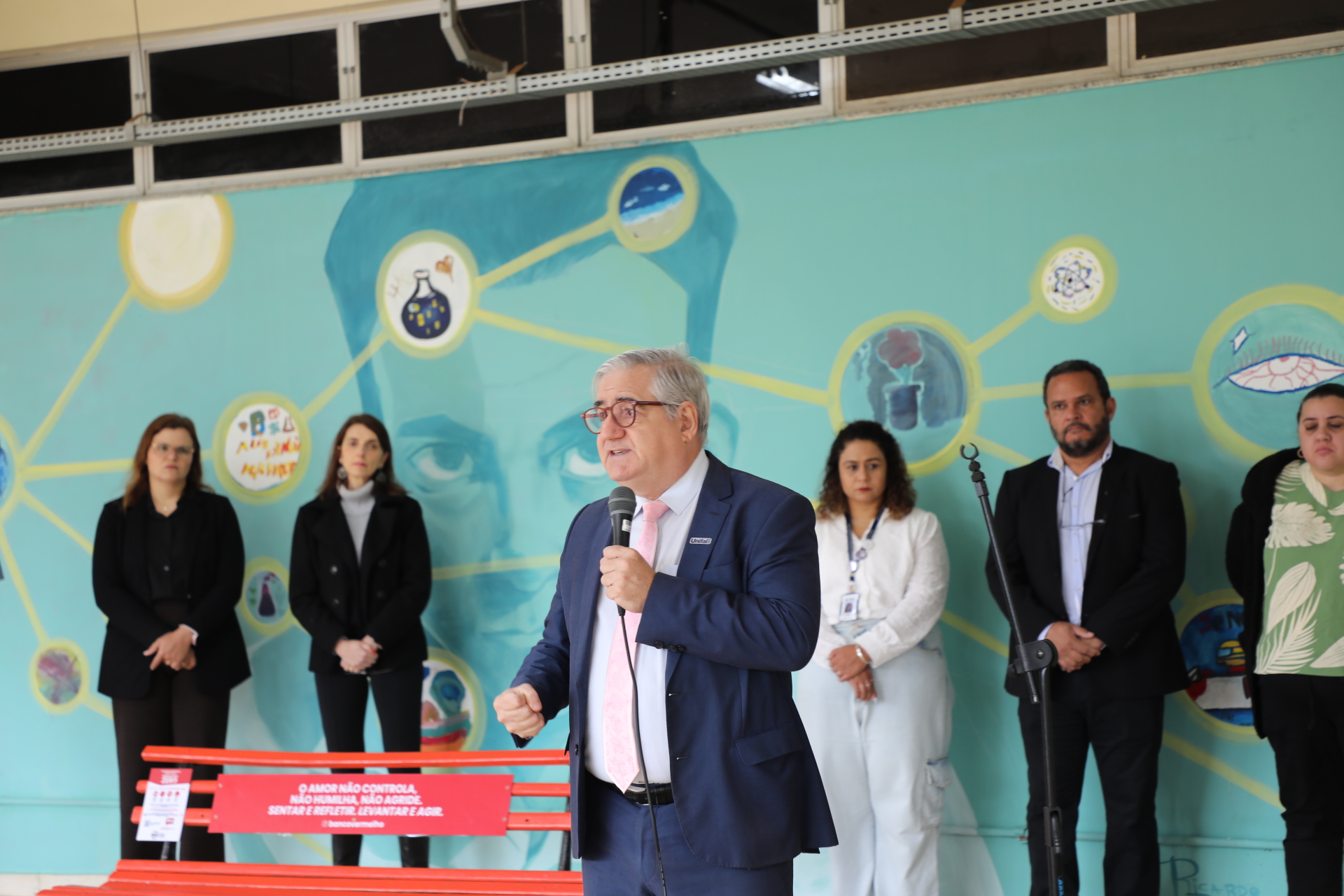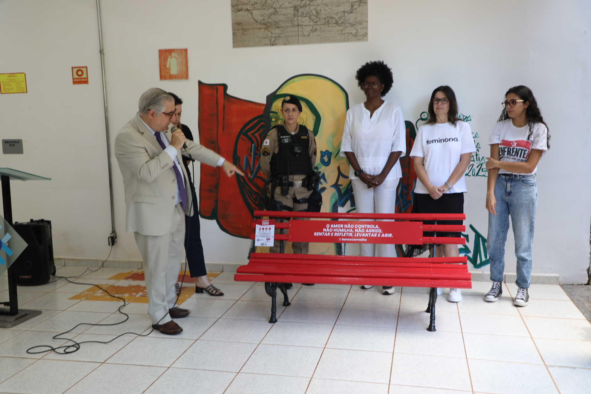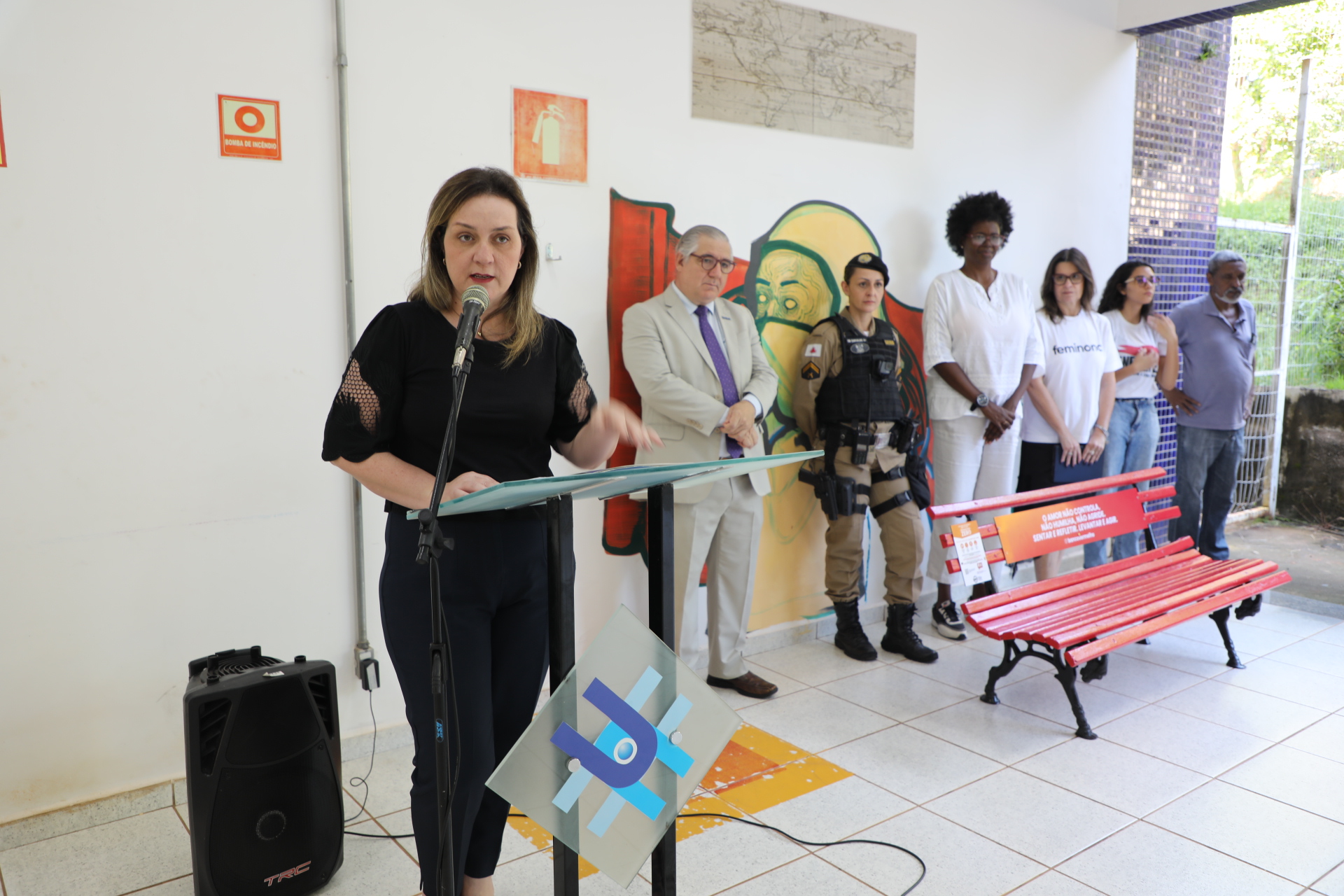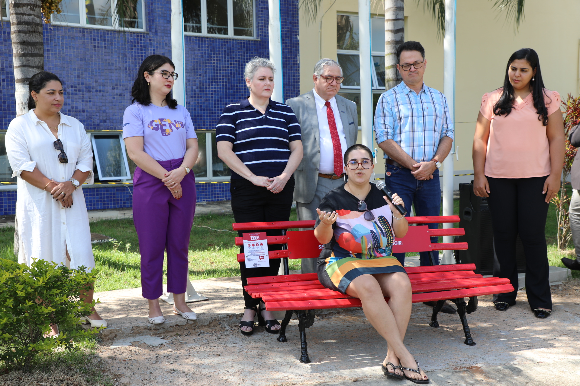 “Para mim não é um prazer inaugurar esse banco. Por eu ser mulher, com direito à liberdade, de ser feliz, de viver plenamente. Porém, com um propósito dedicado à luta pelo feminicídio zero no Brasil, tenho um olhar de luta e esperança de vitória. Eu espero que um dia esse banco esteja pintado de flores, de alegria, não mais vermelho”, salientou.