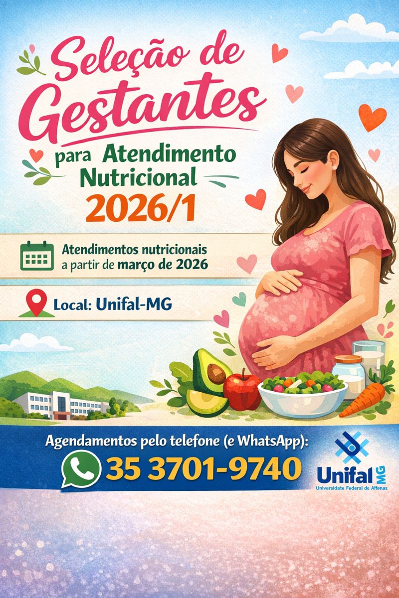 Gestantes interessadas em receber atendimento e acompanhamento nutricional gratuito poderão se inscrever para participar das consultas realizadas no âmbito da disciplina Nutrição Materno Infantil, do curso de Nutrição da UNIFAL-MG. A atividade será conduzida pelo professor Prof. Luiz Felipe de Paiva Lourenção, responsável pela disciplina no semestre 2026/1.