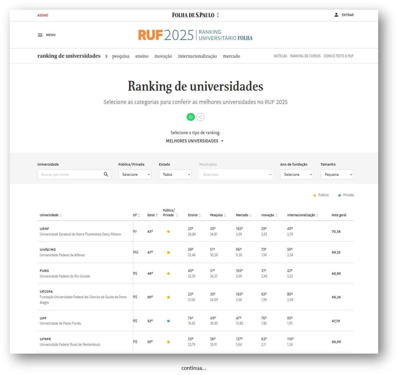 Acesse a plataforma para consultar o ranking de cada um dos cursos filtrando por estado: RUF 2025