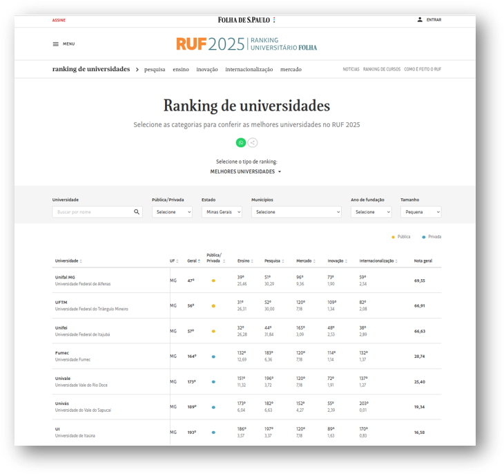 O levantamento, realizado pela Folha de S.Paulo, avaliou 204 universidades de todo o país com base em cinco indicadores: Pesquisa, Ensino, Mercado, Internacionalização e Inovação. A UNIFAL-MG obteve nota final de 69,55. Na classificação nacional, a UNIFAL-MG aparece em 47º lugar geral entre instituições públicas e privadas de todo o país. Em Minas Gerais, a Universidade ocupa a 7ª colocação. Entre as instituições de pequeno porte, a UNIFAL-MG figura na 2ª melhor do país, entre 72 instituições públicas e privadas, e no 1º lugar em Minas.