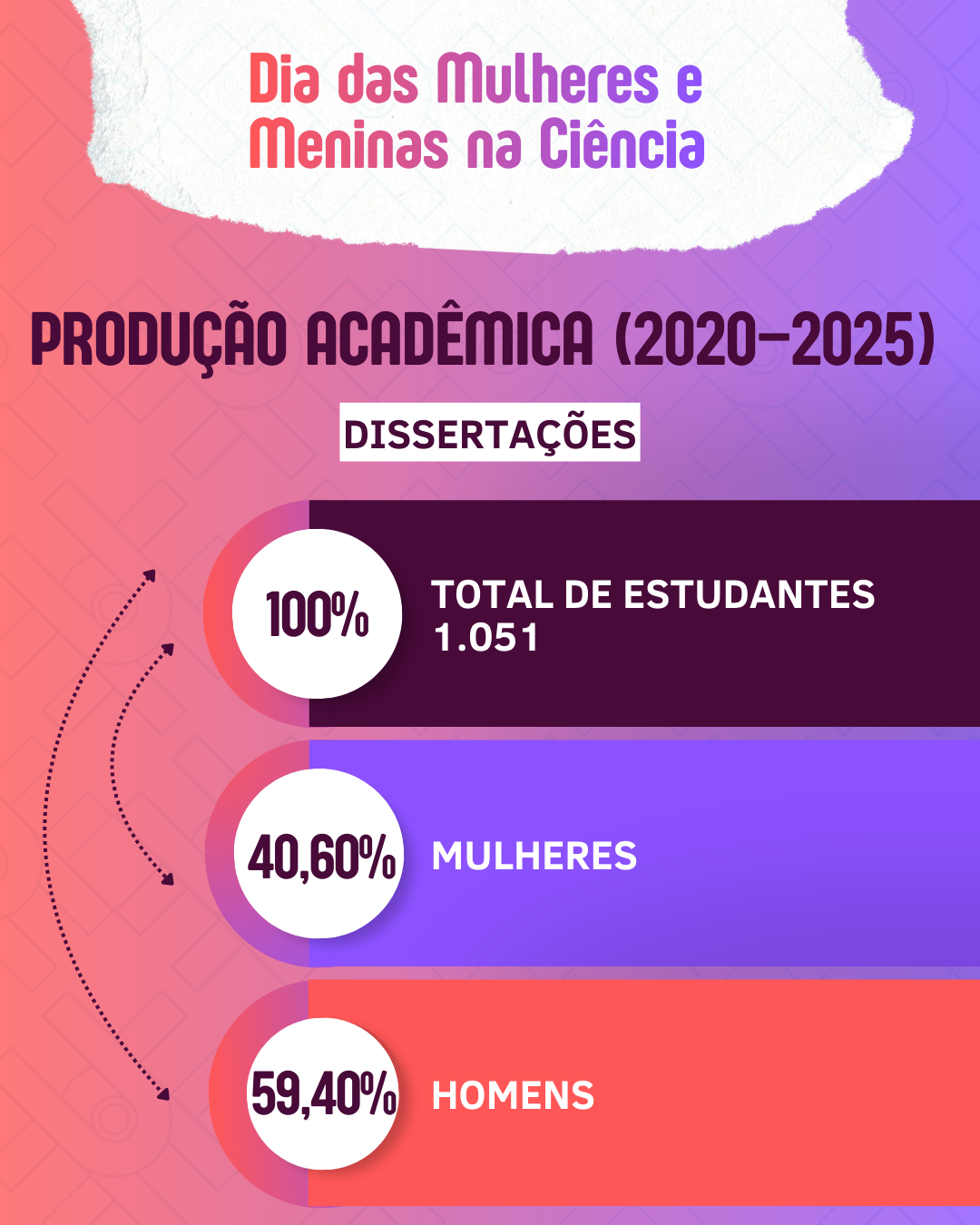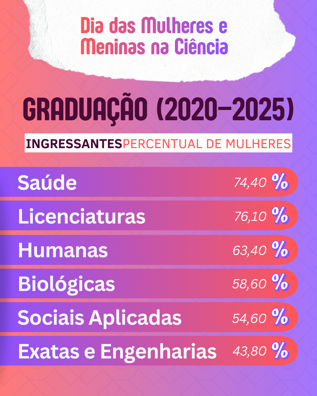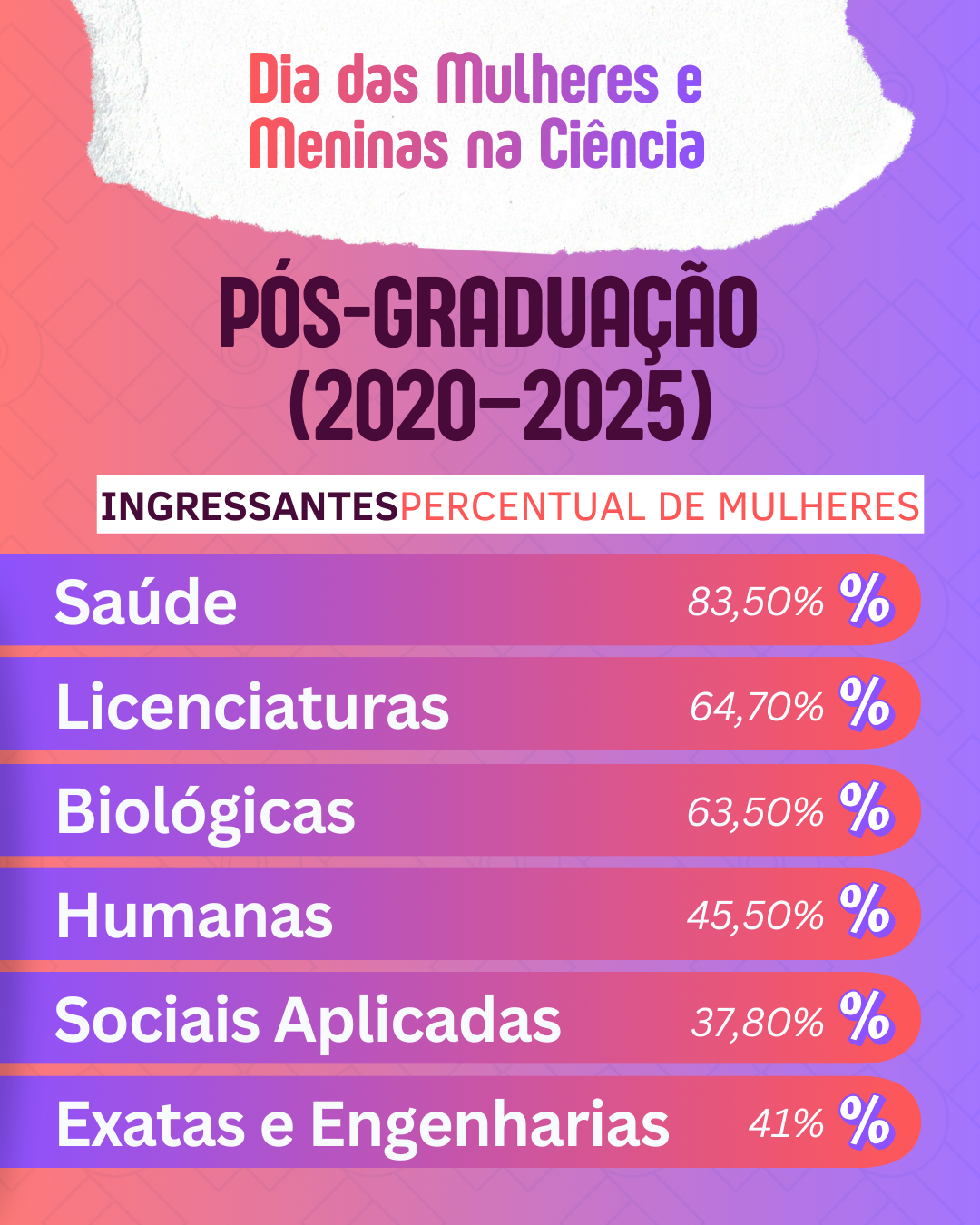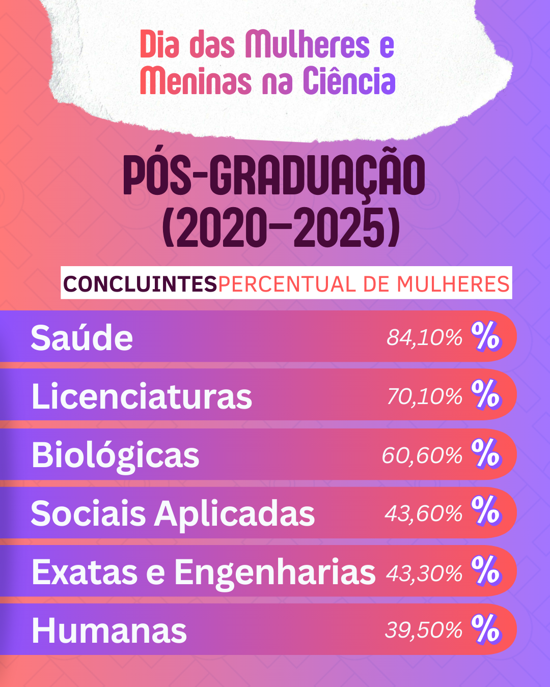 Na pós-graduação, a tendência se mantém. As mulheres são maioria entre ingressantes e concluintes nas áreas da Saúde, Licenciaturas e Biológicas. Entre 2020 e 2025, elas representaram 83,50% dos ingressantes e 84,10% dos concluintes na área da Saúde, além de cerca de dois terços nas Licenciaturas.