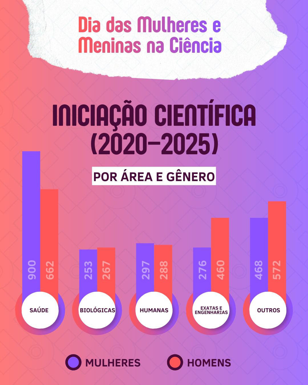 A maior concentração feminina está na área da Saúde, enquanto nas áreas de Exatas e Engenharias os homens são maioria entre os estudantes envolvidos em projetos de Iniciação Científica. Nas áreas de Humanas e Biológicas, os dados mostram distribuição equilibrada entre mulheres e homens.