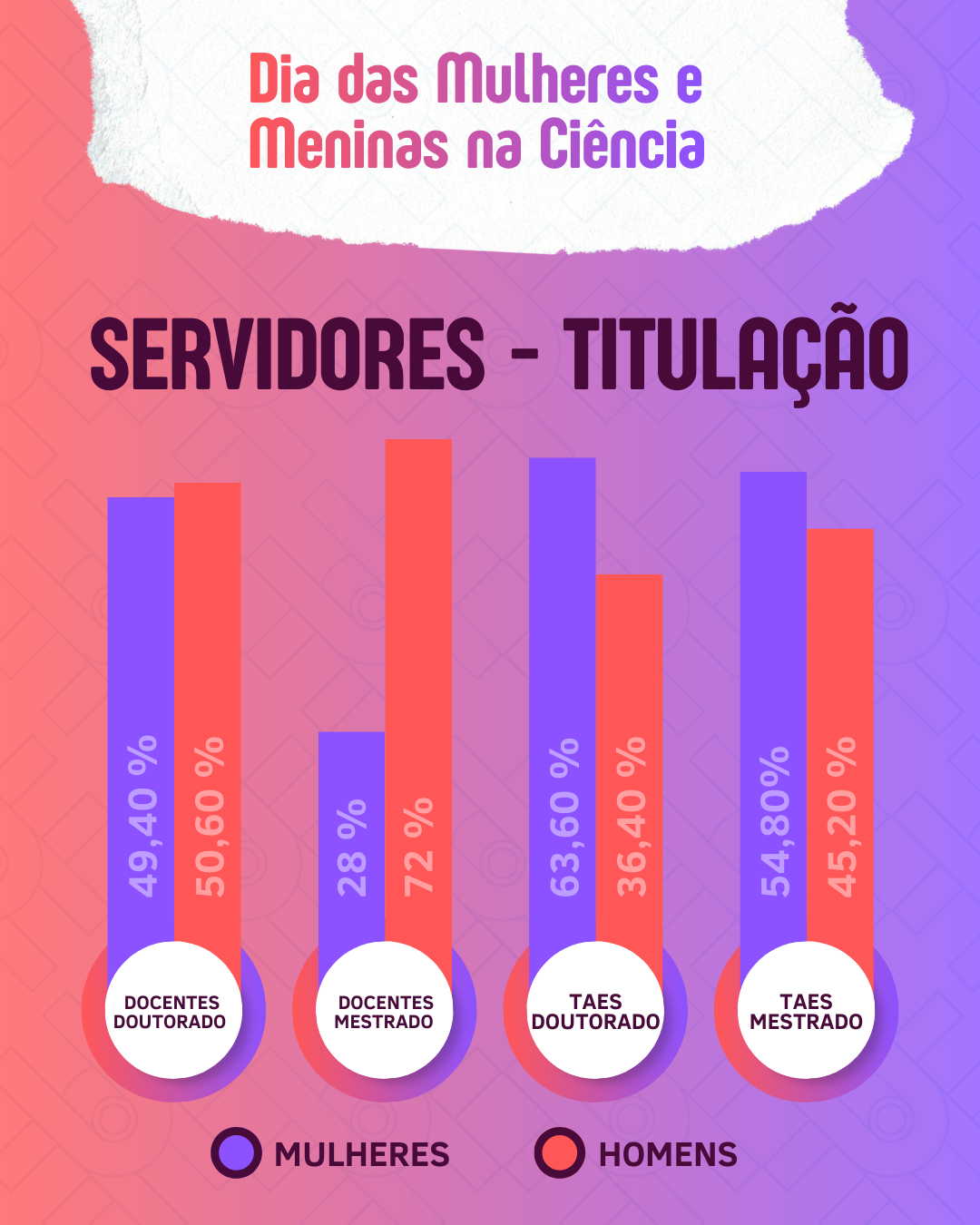 O levantamento também analisou o perfil dos servidores da Instituição quanto à titulação acadêmica. Entre os docentes com doutorado, observa-se um equilíbrio entre mulheres (49,40%) e homens (50,60%). Já entre os docentes que possuem apenas o mestrado, os homens são maioria, representando 72% desse grupo.
