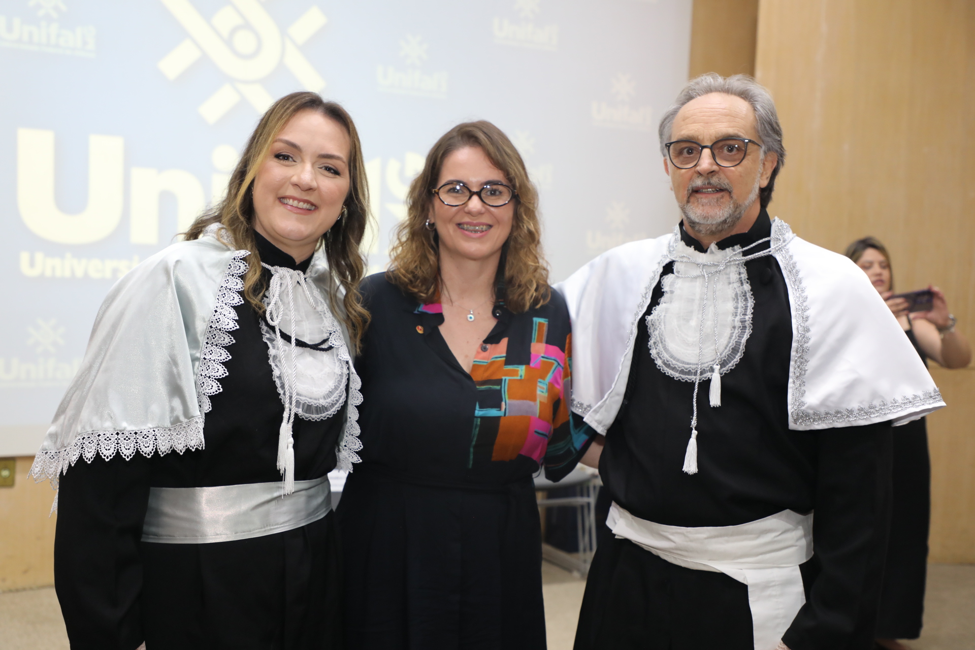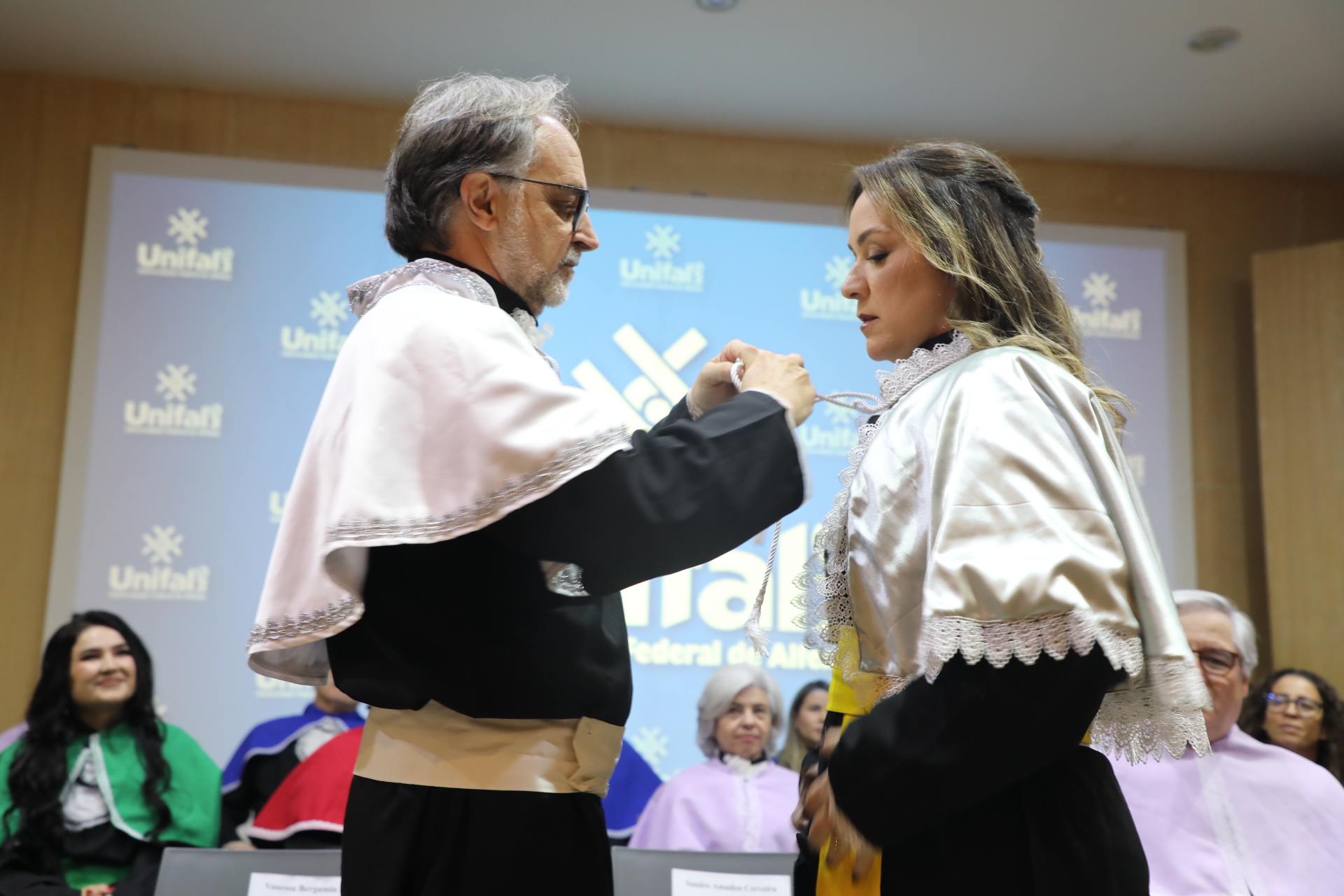 O momento simbólico da investidura foi marcado pela troca das vestes talares, oportunidade em que o professor Alessandro Costa Pereira recebeu a pelerine branca, considerada insígnia tradicional do cargo de reitor, do professor Sandro Cerveira, bem como a faixa que compõe o traje acadêmico, em um gesto que remete às origens medievais das universidades europeias. Na sequência, a professora Vanessa Boralli Marques foi igualmente investida com as vestes correspondentes à Vice-Reitoria, em tom prateado, pelo professor Alessandro Costa Pereira, conforme o protocolo universitário.