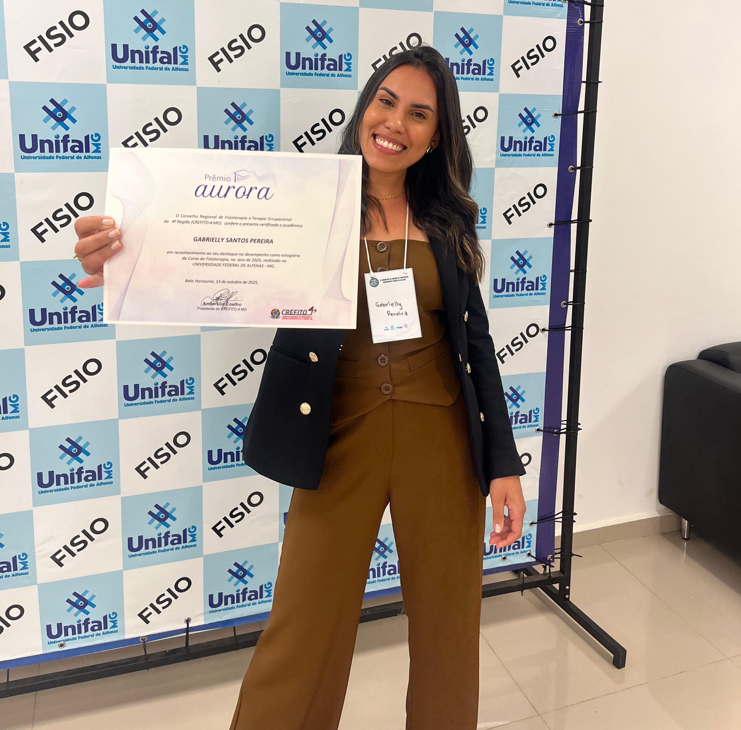 Gabrielly Santos Pereira: Conciliar todas essas atividades não foi simples. A graduação por si só já exige bastante, e quando somamos iniciação científica, projetos de extensão e produção científica, a rotina fica realmente intensa. Acho que o maior desafio foi aprender a organizar meu tempo e lidar com a responsabilidade de entregar resultados de qualidade em cada área. Foi assim que eu ganhei o prêmio Aurora do Crefito 4 de estagiária destaque de 2025.