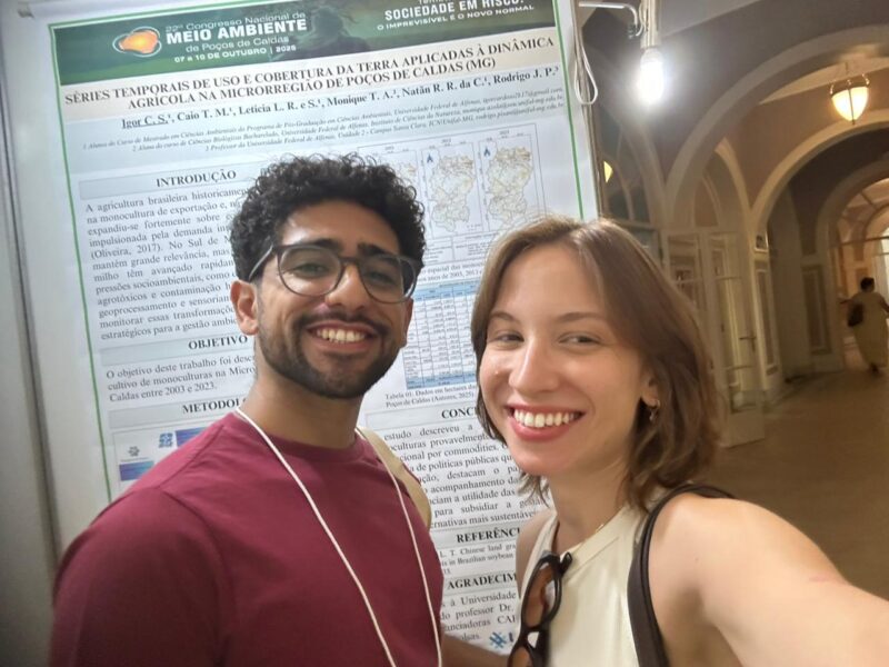 O artigo “Séries temporais de uso e cobertura da terra aplicadas à dinâmica agrícola na microrregião de Poços de Caldas (MG)” foi elaborado pelos mestrandos Igor Cardoso Silva, Caio Tavolaro Melo, Letícia Lopes Rosa e Silva e Natãn Rômulo Ramos da Costa (todos do PPGCA), pela graduanda Monique Tereza Azola (curso de Ciências Biológicas – Bacharelado) e pelo professor Rodrigo José Pisani (docente do ICN na área de Geotecnologias). A comissão científica do CNMA selecionou o trabalho como um dos cinco melhores artigos de 2025 e ele fará parte do e‑book oficial do congresso, que reúne as pesquisas de maior destaque.
