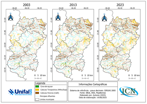 O estudo premiado partiu de uma inquietação levantada pelo próprio orientador do grupo. “Existe relação entre o rápido avanço das monoculturas de soja e milho no sul de Minas Gerais e o aumento da contaminação dos recursos hídricos?”, questionou o professor Rodrigo José Pisani. Para responder a essa pergunta, os pesquisadores usaram geotecnologias e séries temporais de dados do projeto MapBiomas. A equipe aplicou essa abordagem para identificar e analisar as transformações no uso da terra na microrregião de Poços de Caldas no período de 2003 a 2023.