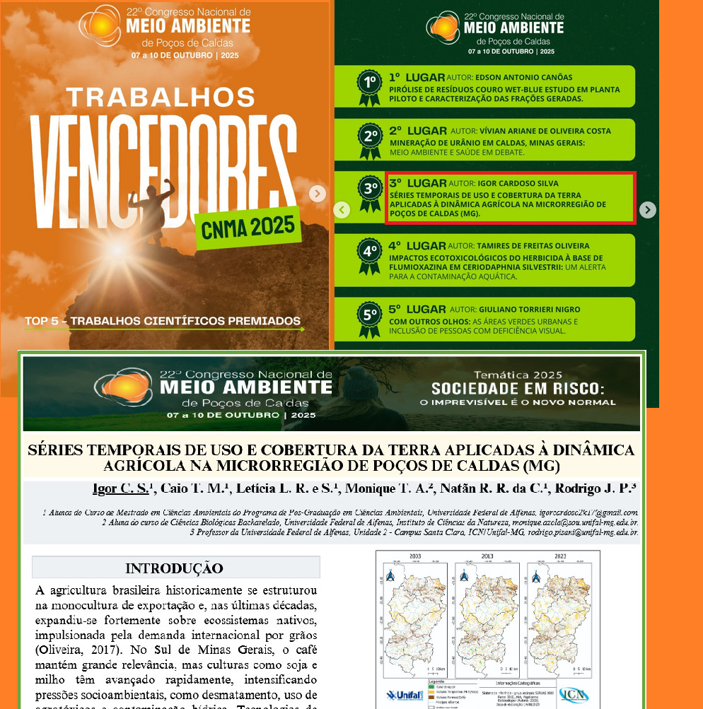 O artigo “Séries temporais de uso e cobertura da terra aplicadas à dinâmica agrícola na microrregião de Poços de Caldas (MG)” foi elaborado pelos mestrandos Igor Cardoso Silva, Caio Tavolaro Melo, Letícia Lopes Rosa e Silva e Natãn Rômulo Ramos da Costa (todos do PPGCA), pela graduanda Monique Tereza Azola (curso de Ciências Biológicas – Bacharelado) e pelo professor Rodrigo José Pisani (docente do ICN na área de Geotecnologias). A comissão científica do CNMA selecionou o trabalho como um dos cinco melhores artigos de 2025 e ele fará parte do e‑book oficial do congresso, que reúne as pesquisas de maior destaque.