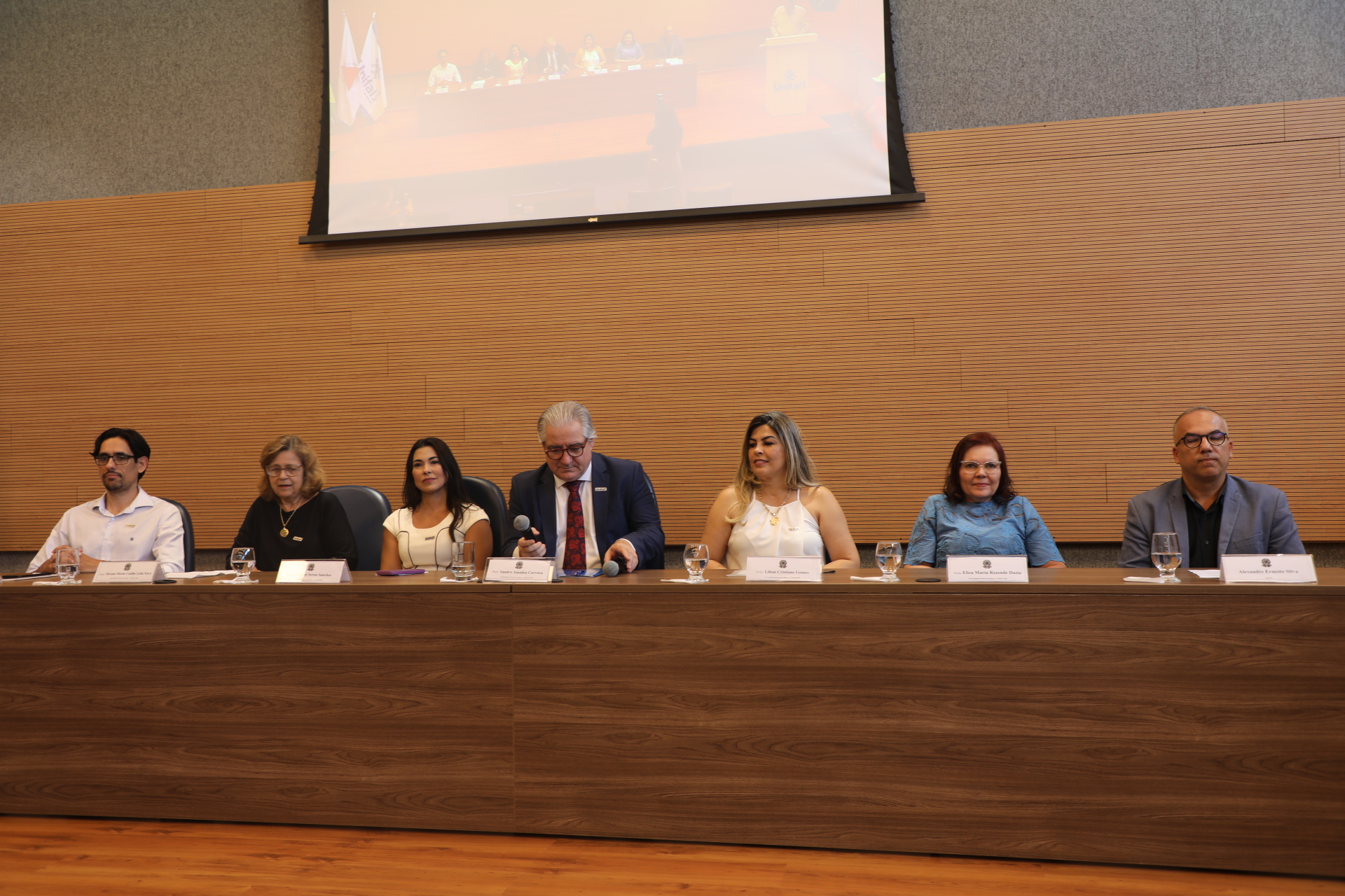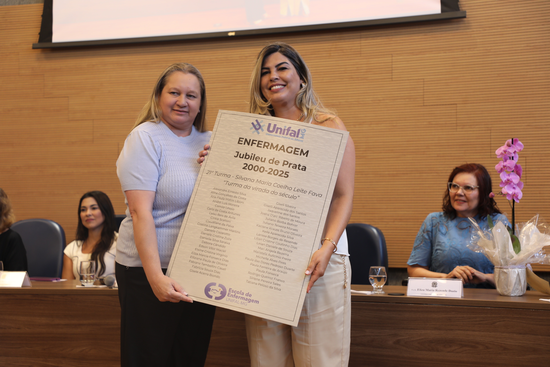 A mesa solene foi composta pelo reitor da UNIFAL-MG, o professor Sandro Amadeu Cerveira, que presidiu a sessão; pela pró-reitora adjunta de graduação, a professora Roberta Seron Sanches; pelo vice-diretor da Escola de Enfermagem, o professor Rogério Silva Lima; pela coordenadora do curso, a professora Lilian Cristiane Gomes; pela paraninfa da turma, a professora Eliza Maria Rezende Dázio; pela professora que deu nome a turma, Silvana Maria Coelho Leite Fava; e pelo egresso e orador da turma Alexandre Ernesto Silva.