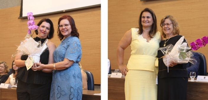 A enfermeira Michele Alves Pires realizou homenagem à paraninfa da turma, a professora Eliza Dázio, e a egressa Larissa Borges de Resende, à professora Silvana Fava. Em seguida, a enfermeira Elaine Cristina Virgínio Borges entregou a placa comemorativa à coordenadora do curso de Enfermagem, Lilian Gomes.