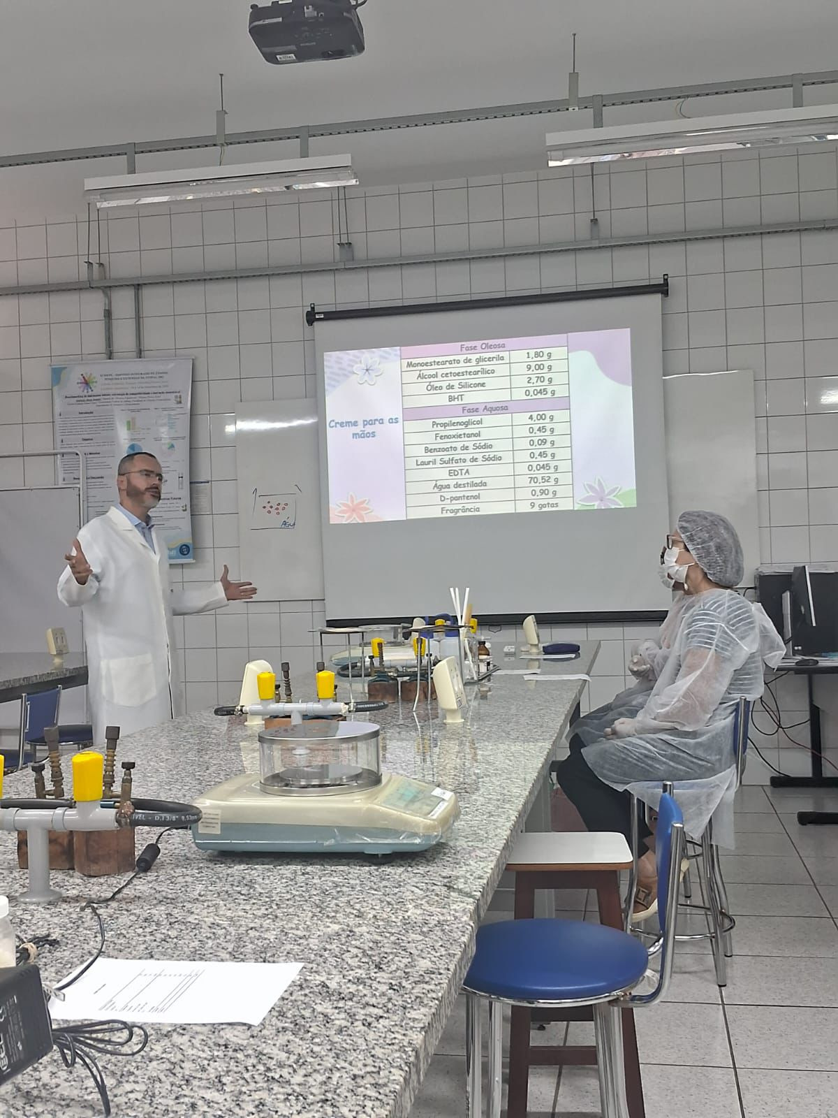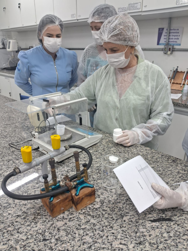 Por fim, a quarta atividade abordou os ingredientes ativos e os fatores externos que influenciam a eficácia dos hidratantes. Após esses momentos de trocas, as participantes colocaram a mão na massa em uma atividade prática de manipulação. Utilizando balança e outros utensílios de laboratório, prepararam um creme hidratante para as mãos, exercitando etapas de pesagem, mistura, emulsificação e envase.