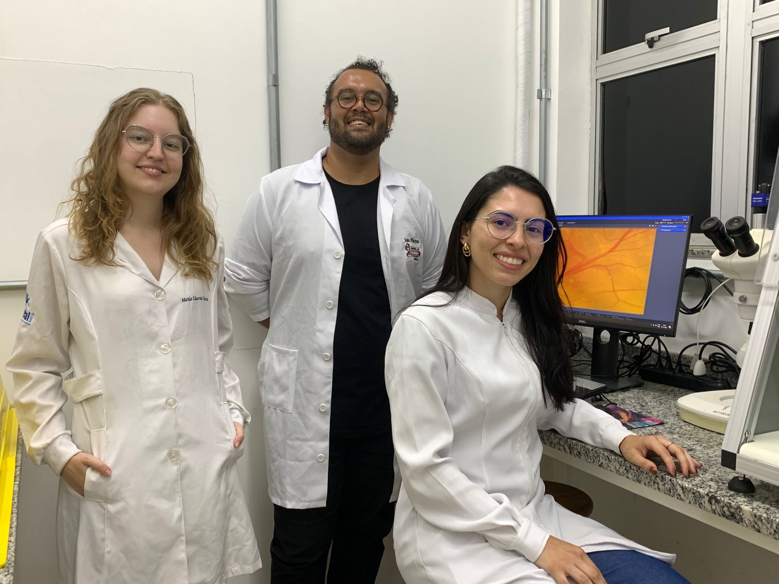 Equipe técnica da pesquisa: Maria Eduarda do Vale Uliniki Teixeira (Medicina), João Marcos Oliveira Silva (doutorando em Biociências Aplicadas à Saúde) e Luisa Cardoso Azola (Biotecnologia). (Foto: Arquivo/Angel Mauricio Gamero)