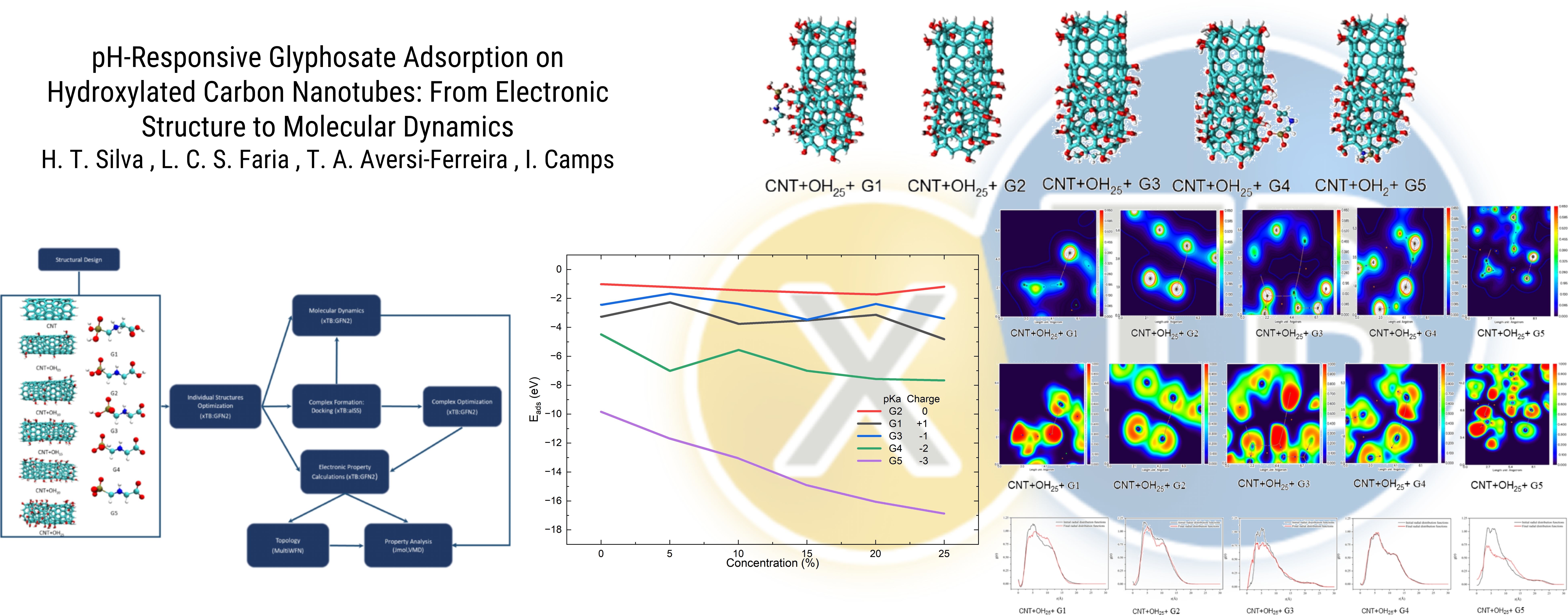Além do convite editorial, o docente também destaca um trabalho recente aceito na revista Applied Surface Science (Elsevier), com participação de pós-graduandos da UNIFAL-MG: os mestres em Física Letícia Faria e Tales Aversi (PPGF) e o doutorando em Ciências Ambientais Heberson Silva (PPGCA). O estudo investiga o uso de nanotubos de carbono funcionalizados para a captura de glifosato em diferentes condições de pH, conectando estrutura eletrônica e simulações de dinâmica molecular.