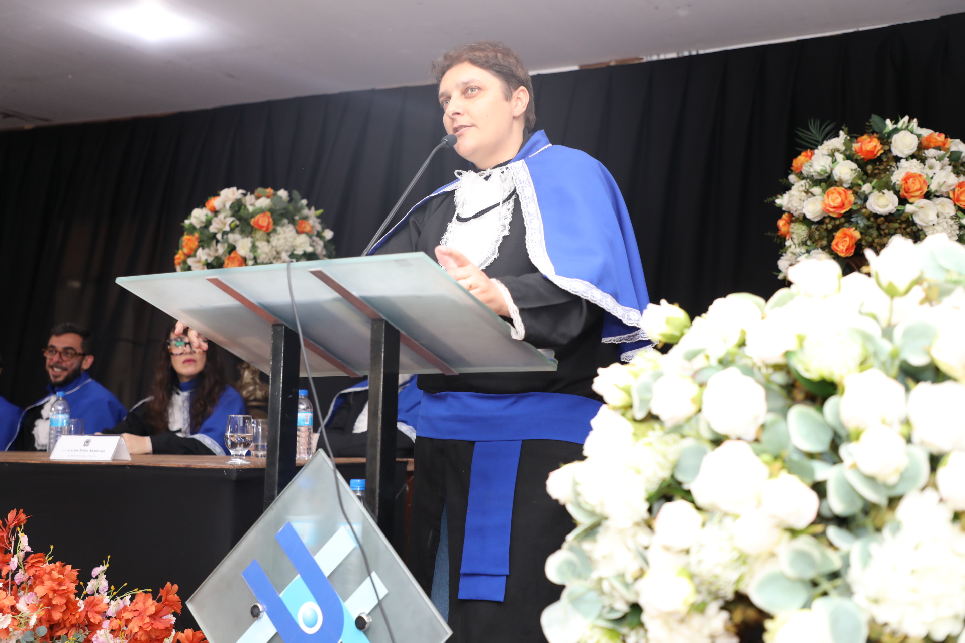 A mesa de honra foi composta pelo vice-reitor, o professor Alessandro Antônio Costa Pereira; pela coordenadora do curso de Biomedicina, a professora Estela Regina de Oliveira; pelo coordenador do curso de Biotecnologia, o professor Marcos Vinicios Salles Dias; pela coordenadora do curso de Ciência da Computação, a professora Mariane Moreira de Souza; pela coordenadora do curso de Ciências Biológicas, a professora Marília Gabriela Alves Goulart Pereira; pelo coordenador do curso de Ciências Sociais, o professor Carlos Tadeu Siepierski; pelo coordenador do curso de Geografia, o professor Marcelo de Oliveira Latuf; e pela coordenadora do curso de Letras – Línguas Estrangeiras, a professora Juliana Pimenta Attie.