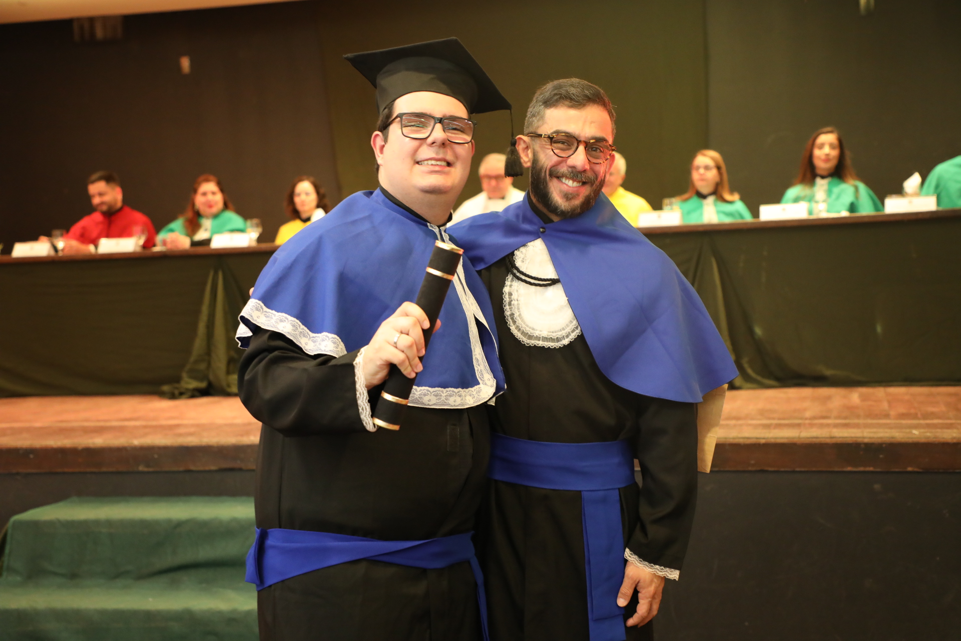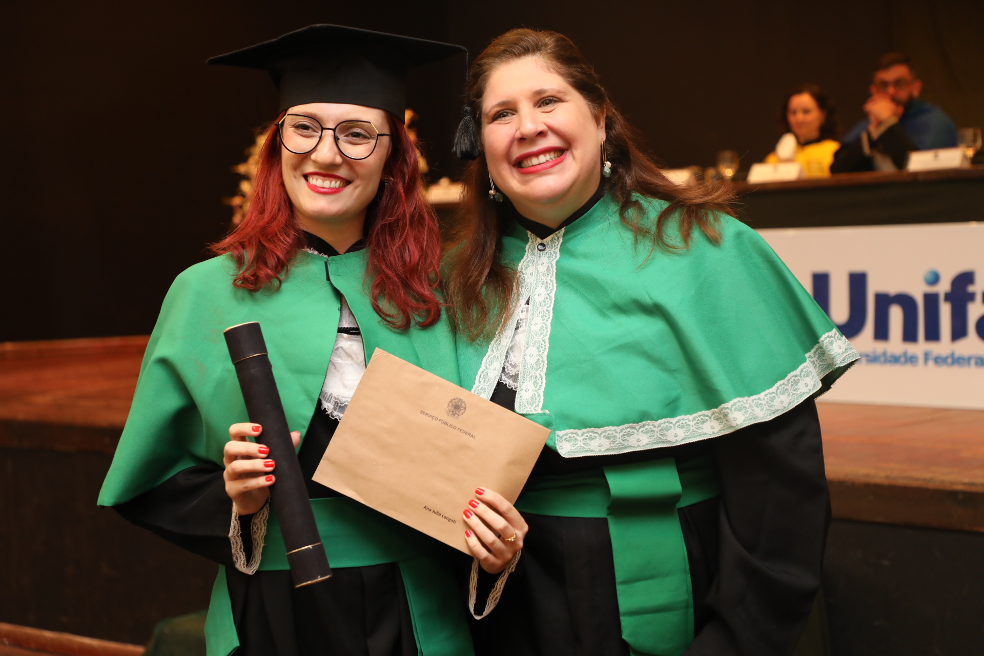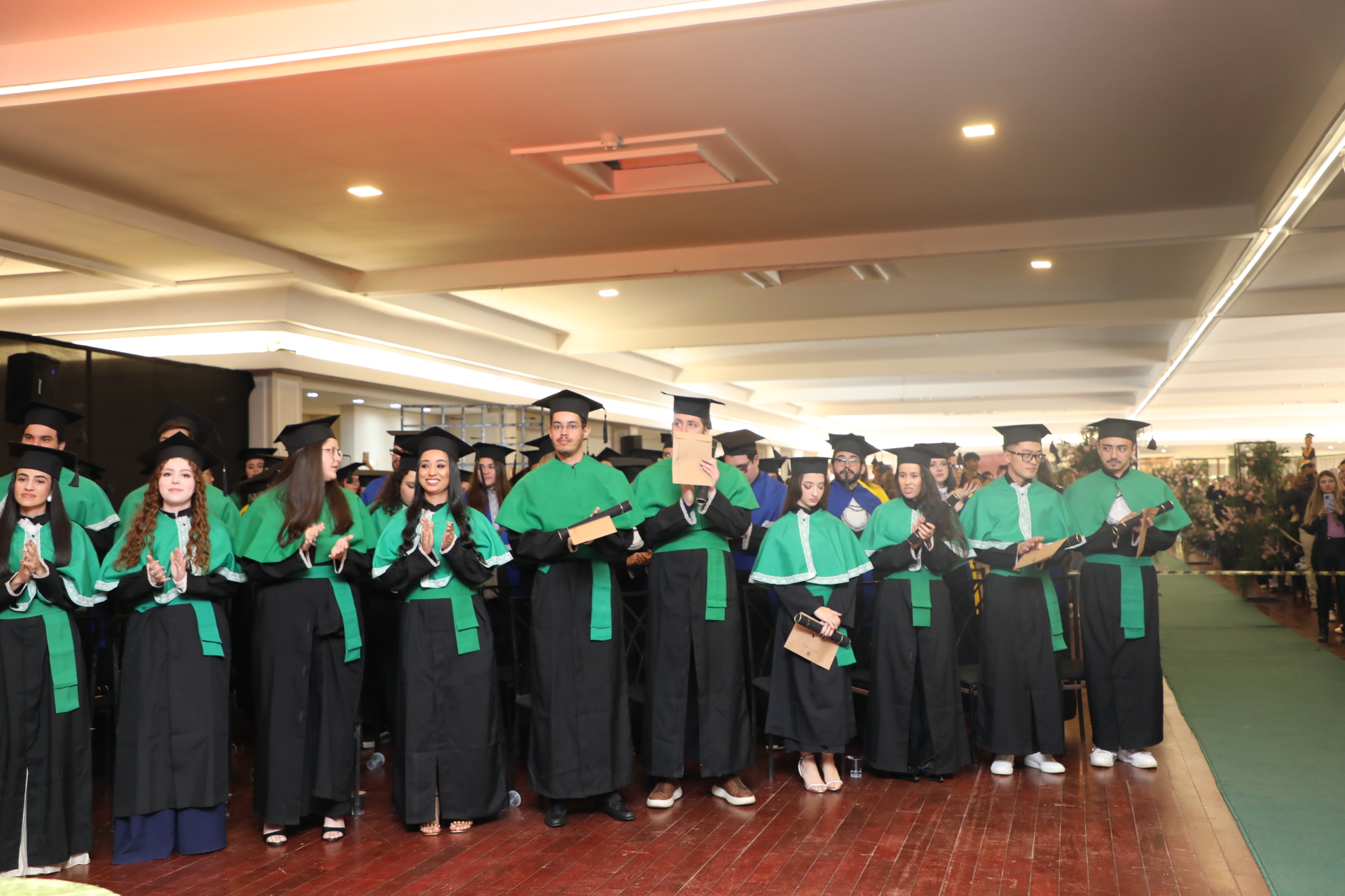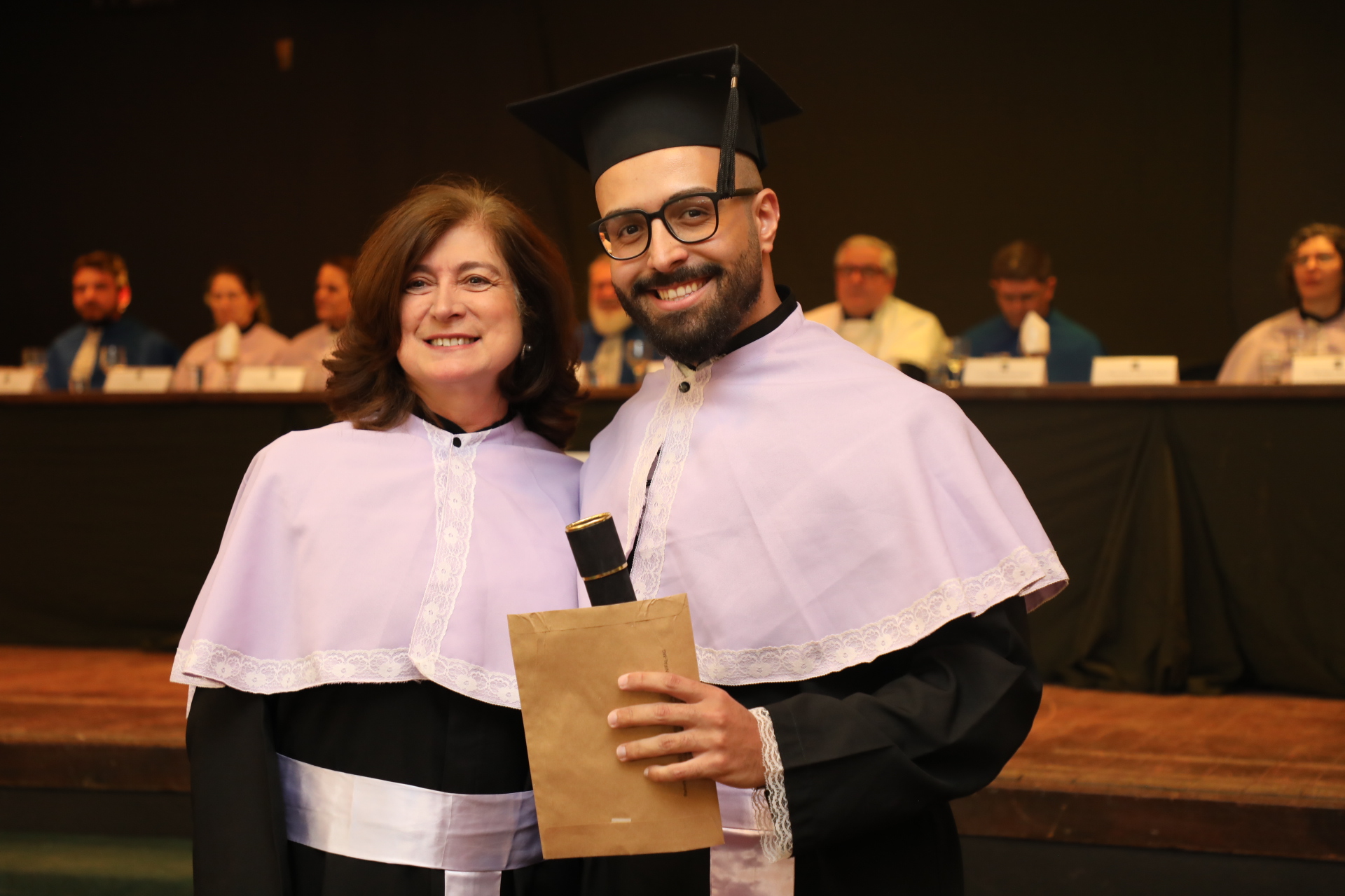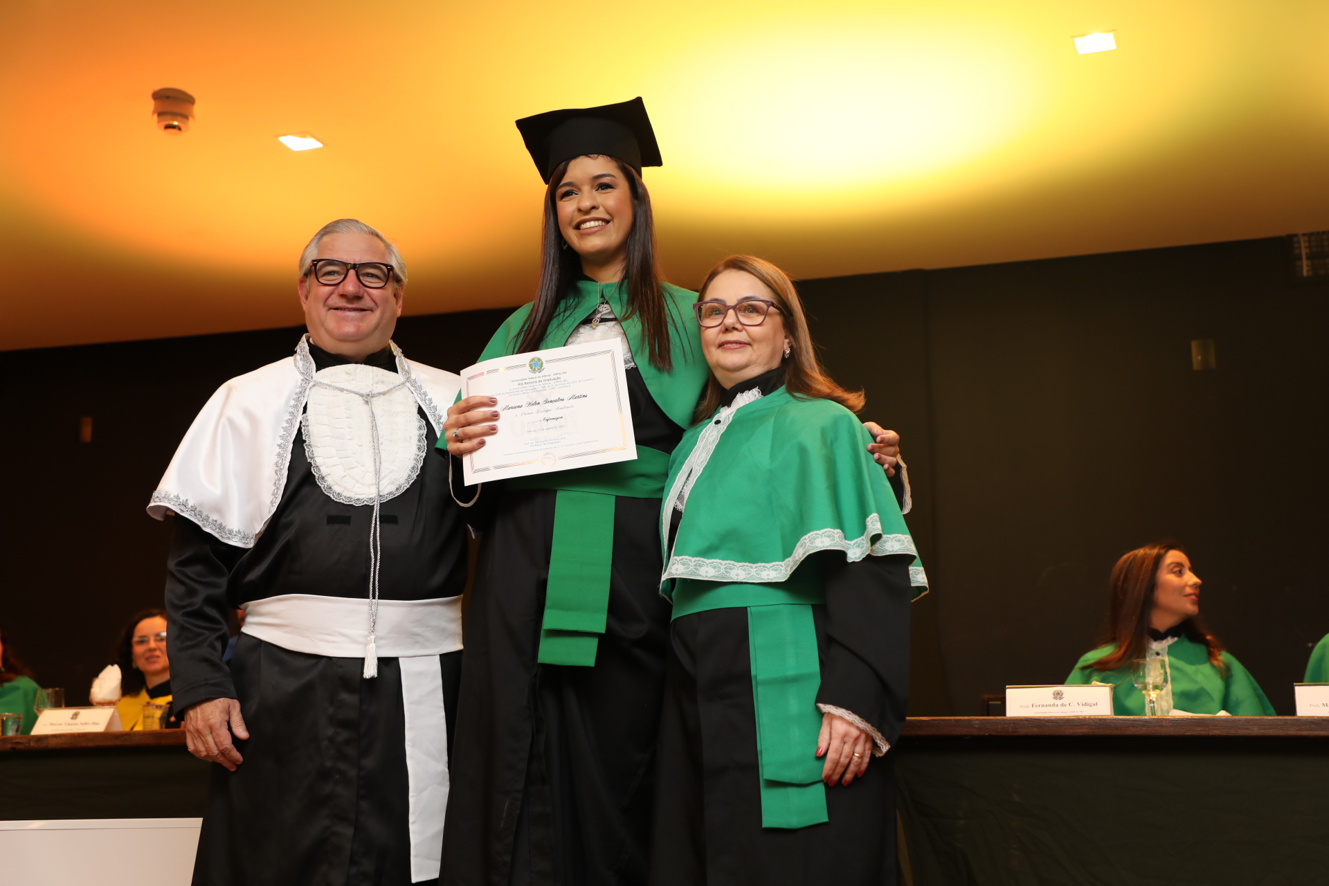 Seguindo a cerimônia, o reitor conferiu os graus de bacharéis (las) e entregou o capelo, simbolicamente, para Laura da Silva Cruz, formanda do curso de Farmácia. Os demais formandos receberam os certificados entregues pelos coordenadores.