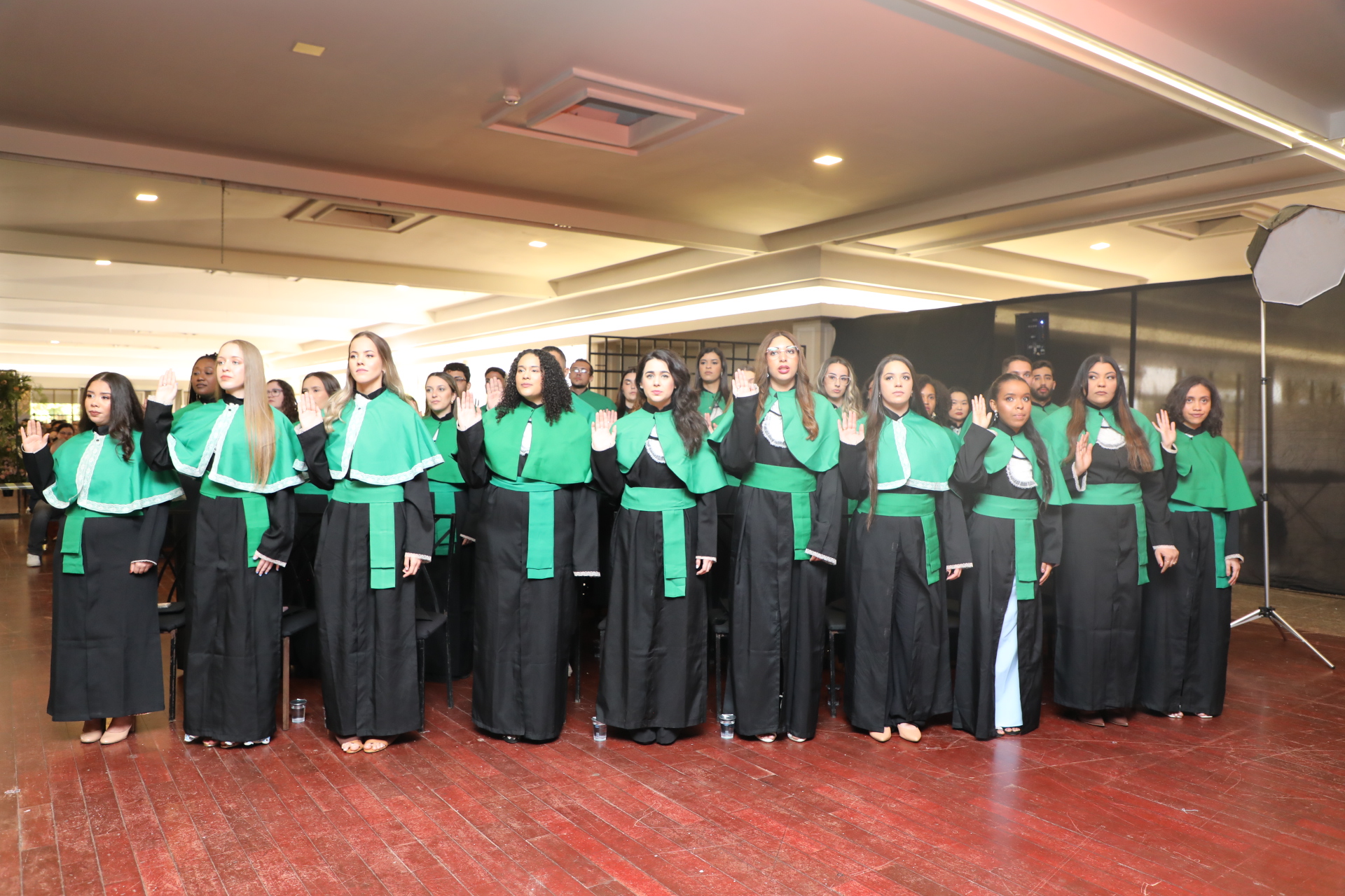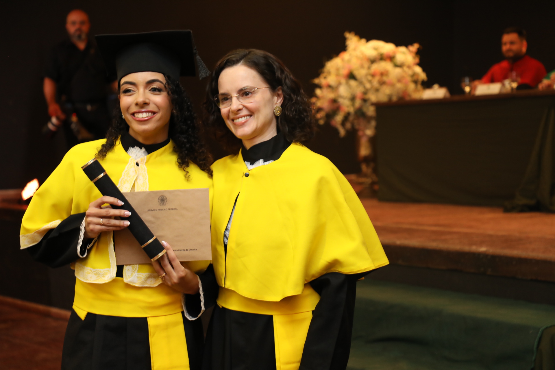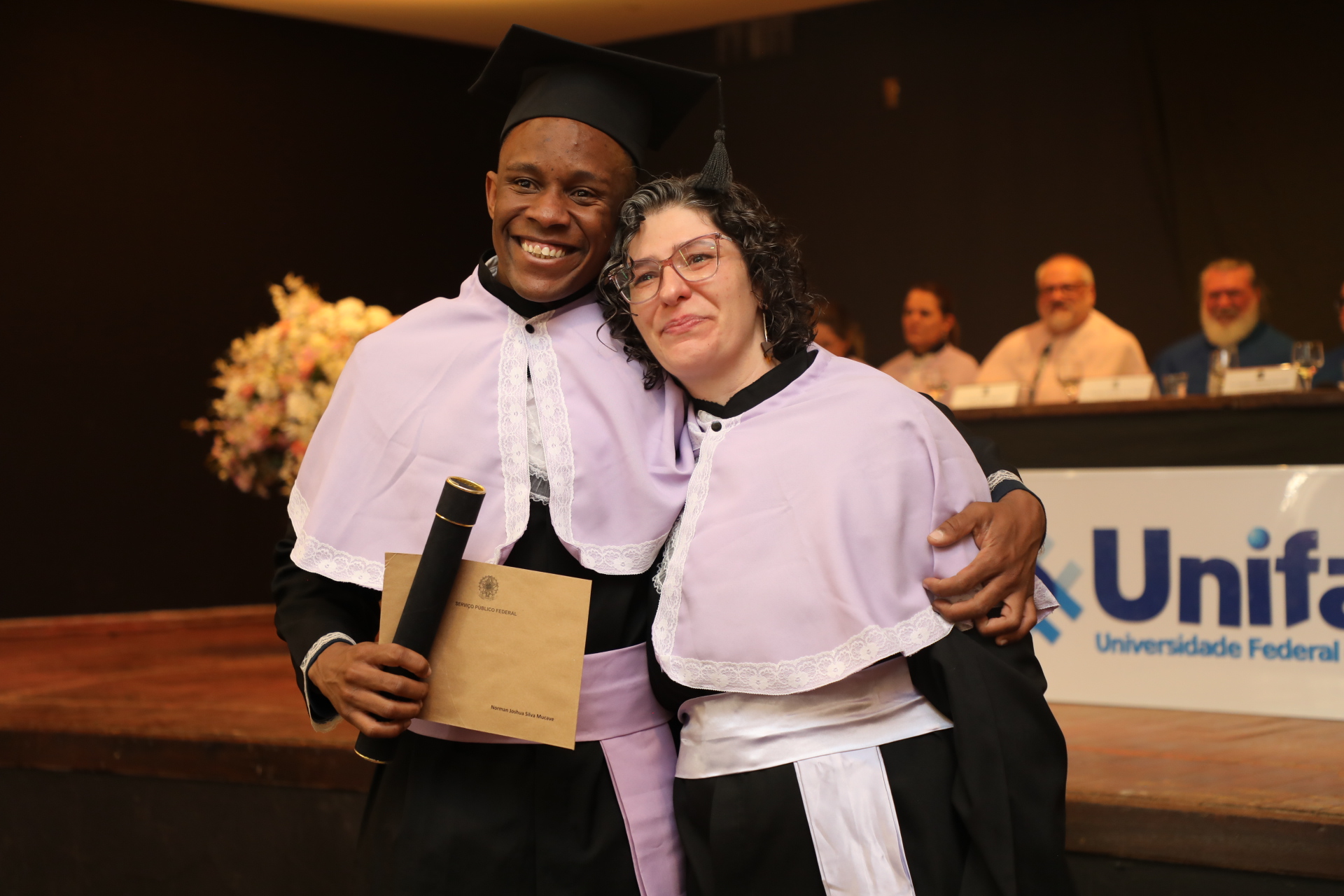 O juramento solene, pronunciado por Brenda Melo da Silva, bacharela do curso de Química, foi seguido por Ohiama Aires Antunes Bráulio Fernandes, licenciado em História, que recebeu o capelo do reitor.