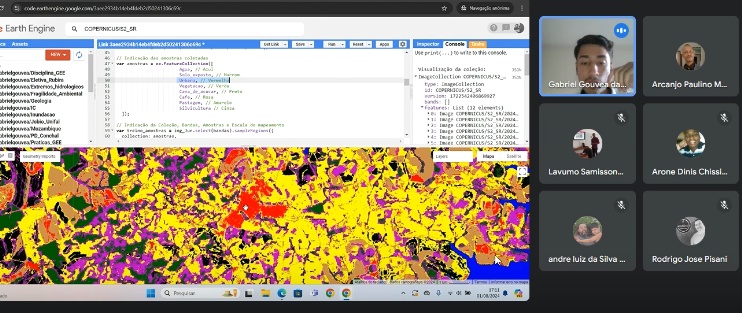 No mesmo dia, foi realizada uma oficina de integração com o discente de Pós-Graduação em Ciências Ambientais (PPGCA) da Universidade, Eduardo Mondlane, e o discente de graduação em Geografia Bacharelado, Gabriel Gouvea da Silva, abordando o tema “Classificação de imagens em sensoriamento remoto utilizando a ferramenta Google Earth Engine”.