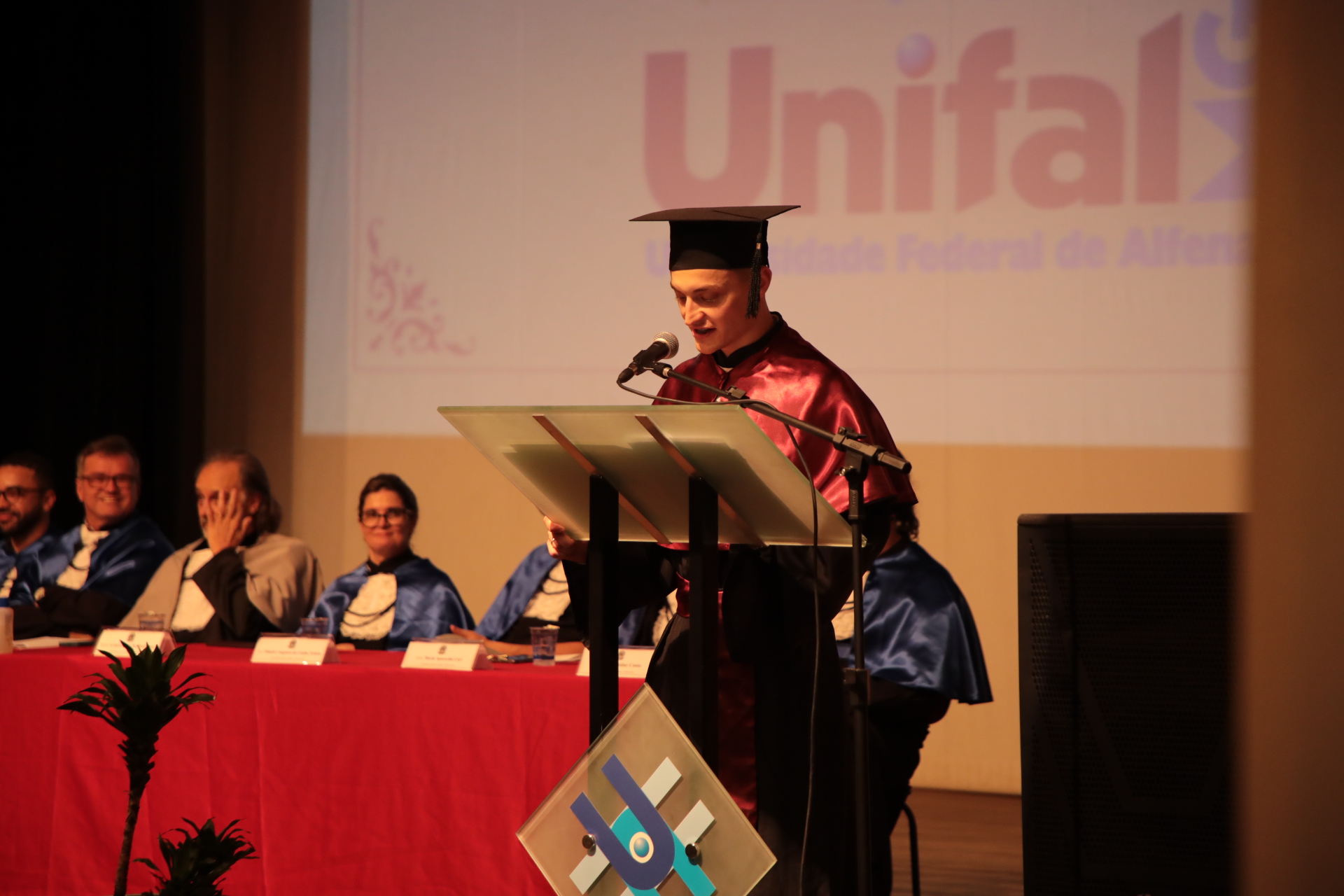 Para a realização do discurso aos colegas, foi convidado o bacharel em Ciências Contábeis André Luís de Carvalho. “Nos despedimos hoje desta instituição, com a certeza que estamos saindo pessoas melhores do que quando entramos, e que levamos em nossos corações todos momentos vivenciados na UNIFAL-MG, e também com o sentimento que essas portas sempre estarão abertas para se caso decidirmos voltar como alunos ou quem sabe como professores, para disseminar o que nos foi passado”, salientou.