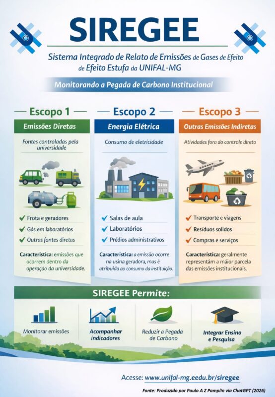 A UNIFAL-MG passou a contar, desde o dia 2 de março de 2026, com o Sistema Integrado de Relato de Emissões de Gases de Efeito Estufa (SIREGEE), uma plataforma digital desenvolvida para monitorar, organizar e divulgar as emissões de gases de efeito estufa associadas às atividades institucionais da Universidade.