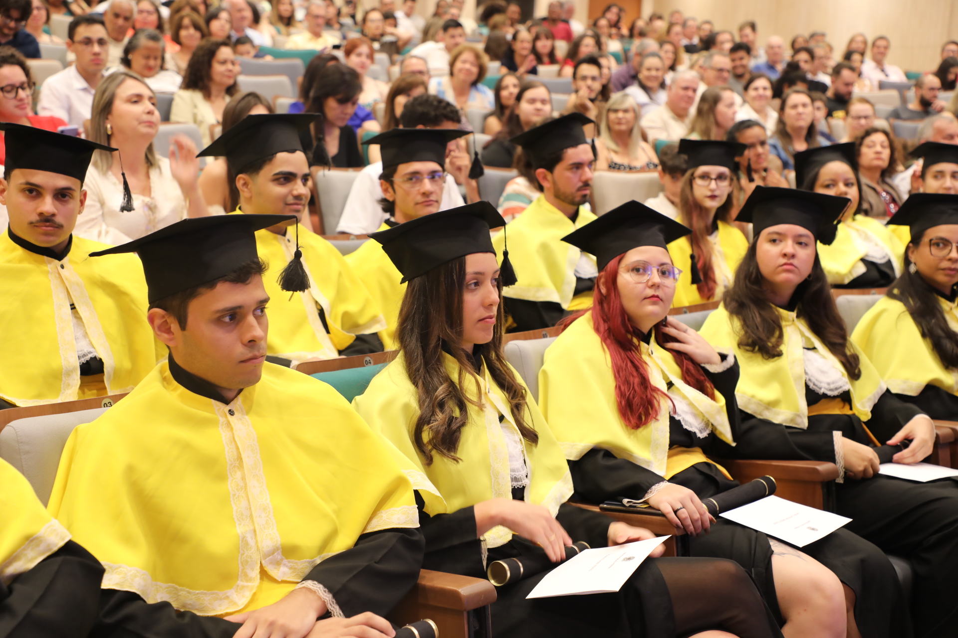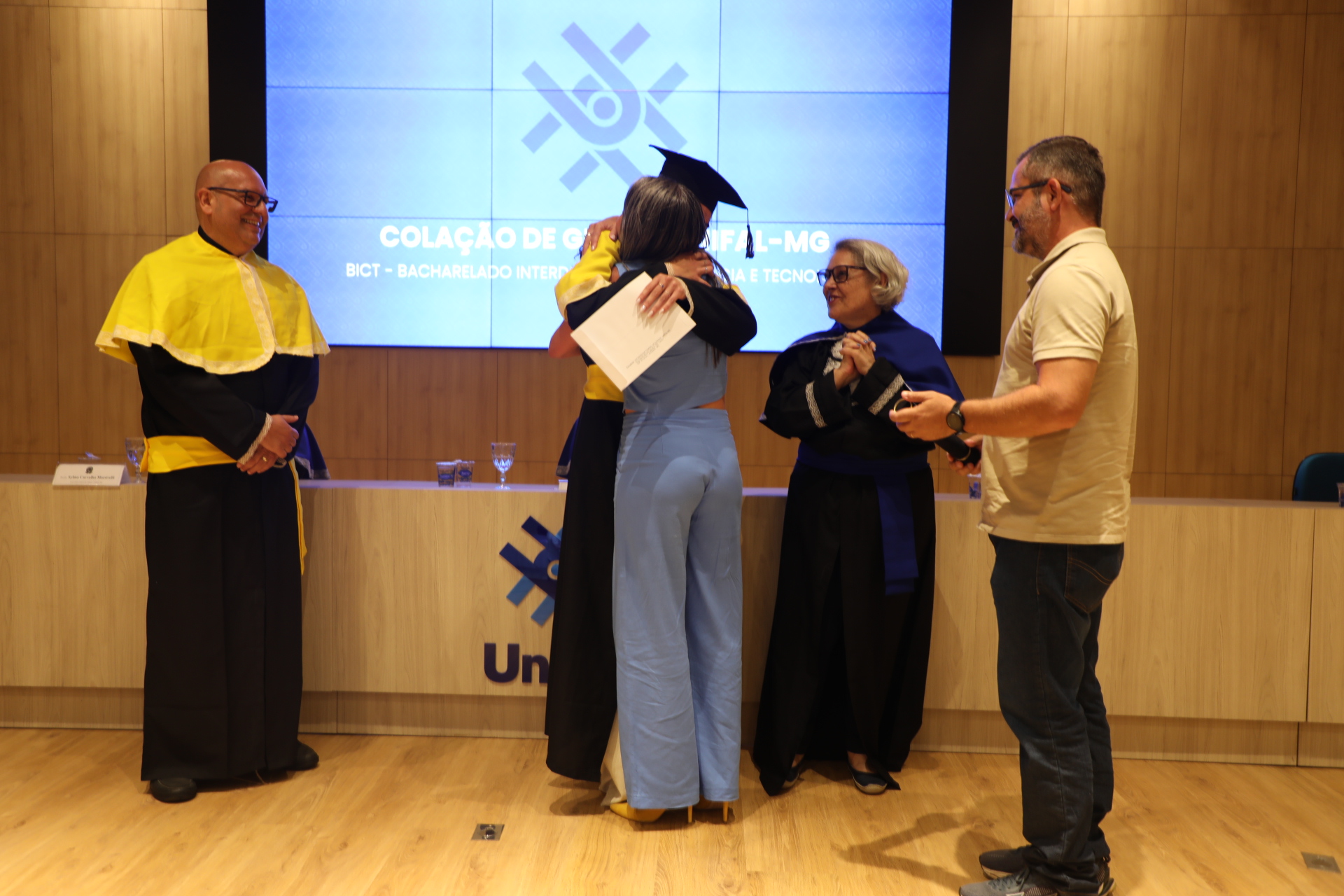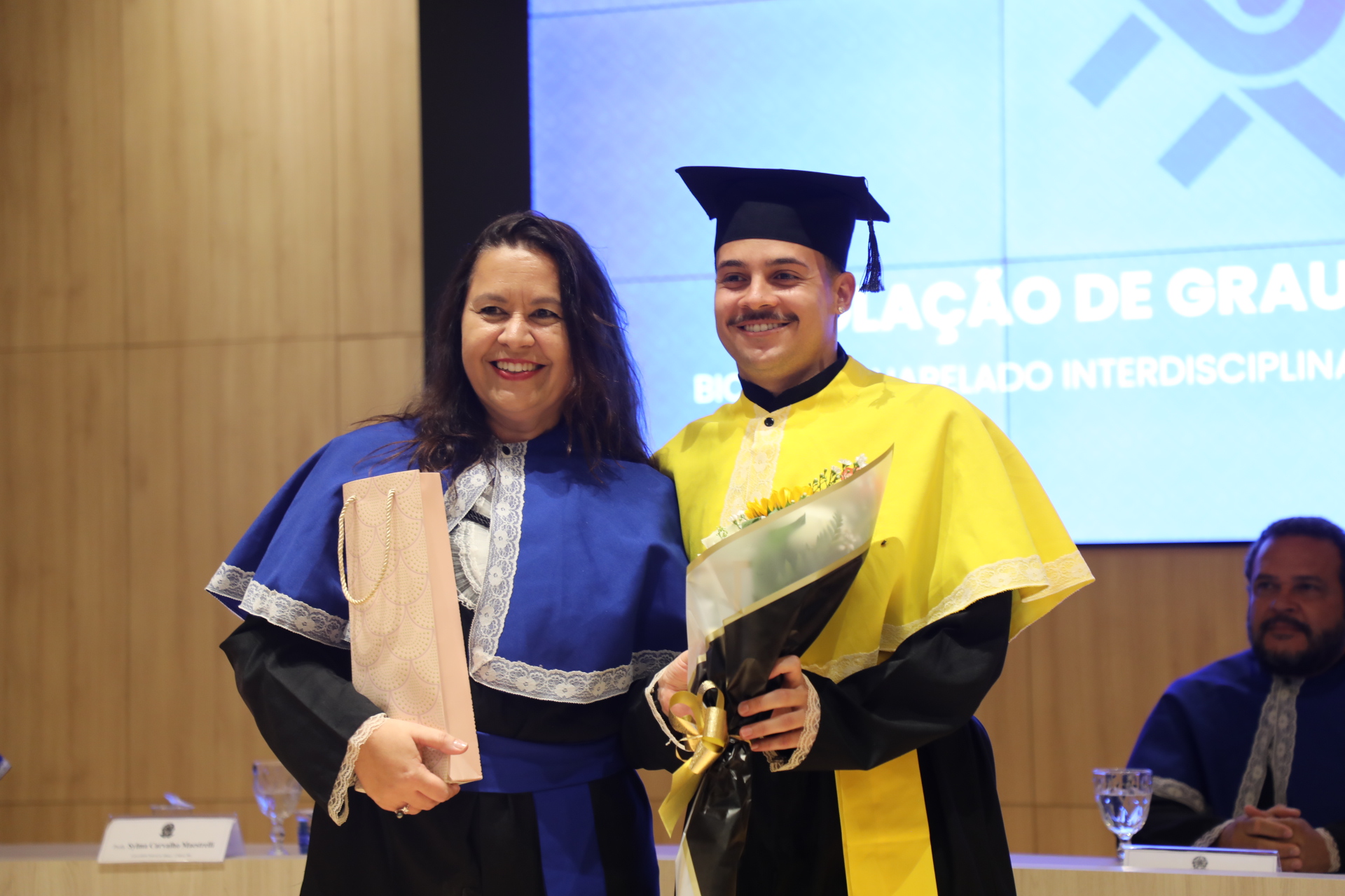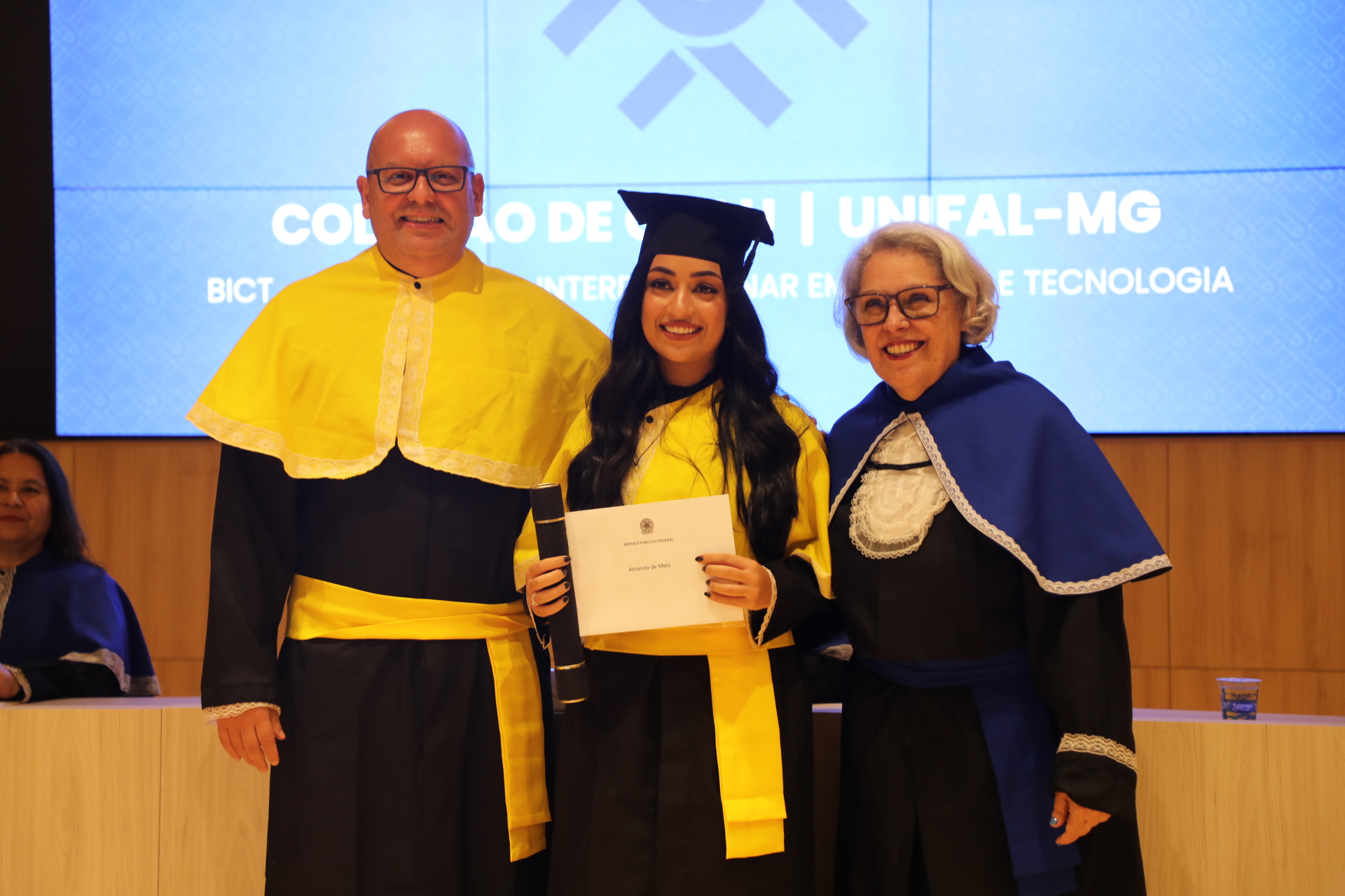 À tarde, a solenidade do Bacharelado Interdisciplinar em Ciência e Tecnologia (BICT) conferiu grau a 41 bacharéis. A juramentista Camila Helena do Carmo Tonon leu o juramento e a capelista Alana Farias Figueiredo representou a turma. O orador Gabriel Lucas Pereira Ramos lembrou que a formação em ciência e tecnologia é marcada por desafios e descobertas: “O ciclo básico nos ensinou a pensar, a questionar, a errar, a persistir e, sobretudo, a aprender”, afirmou. Ele relatou momentos emblemáticos – a temida ponte de macarrão, os relatórios em grupo, os seminários e o nervosismo das apresentações – e reconheceu o apoio mútuo entre colegas, especialmente durante a redação do Trabalho de Conclusão de Curso (TCC): “Quase sempre aparecia um amigo insistente, perguntando ‘E o TCC, como está?’, não para cobrar, mas para incentivar”. Gabriel incentivou os colegas a seguirem seus próprios ritmos e destacou: “Persistir é o que abre caminhos.”