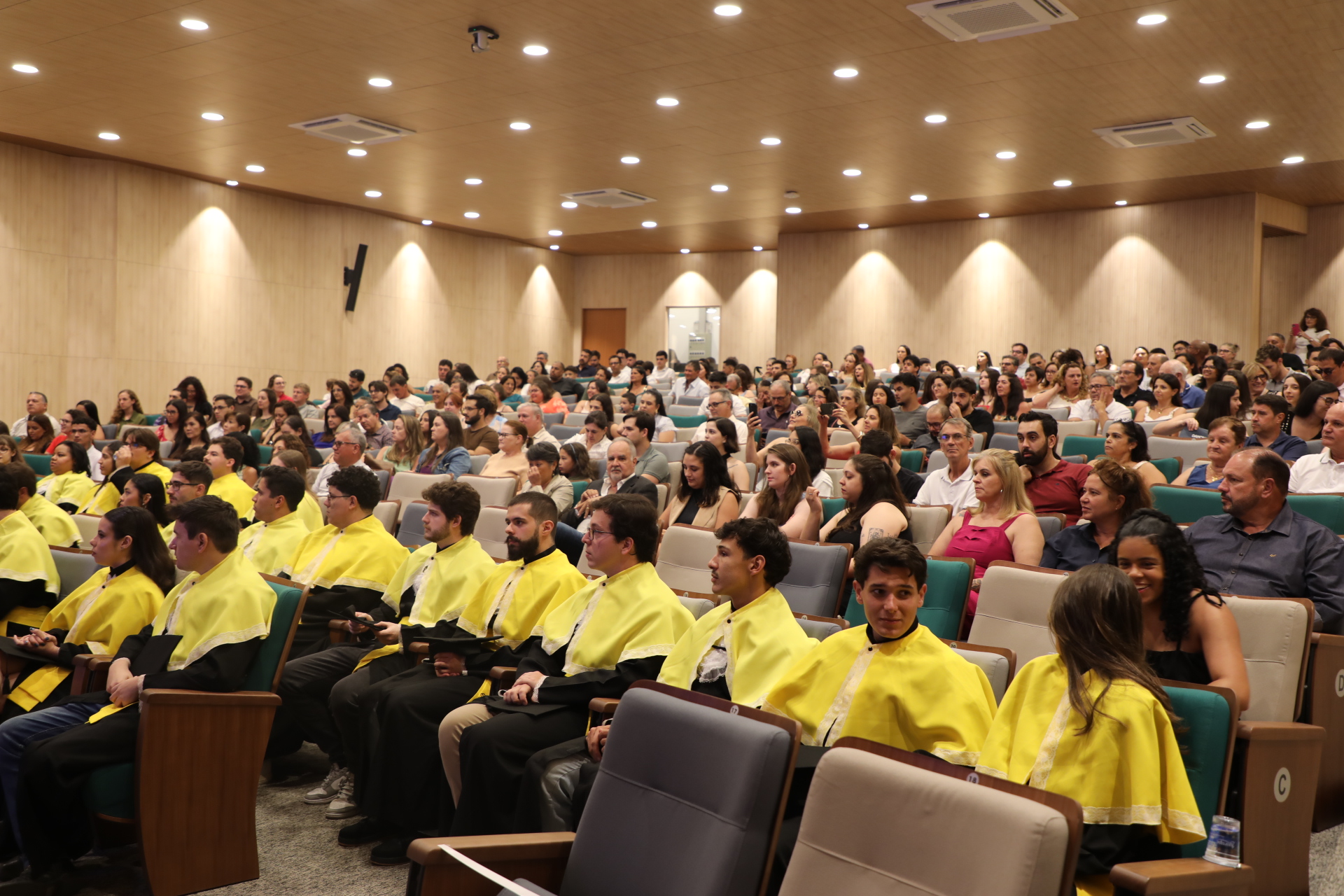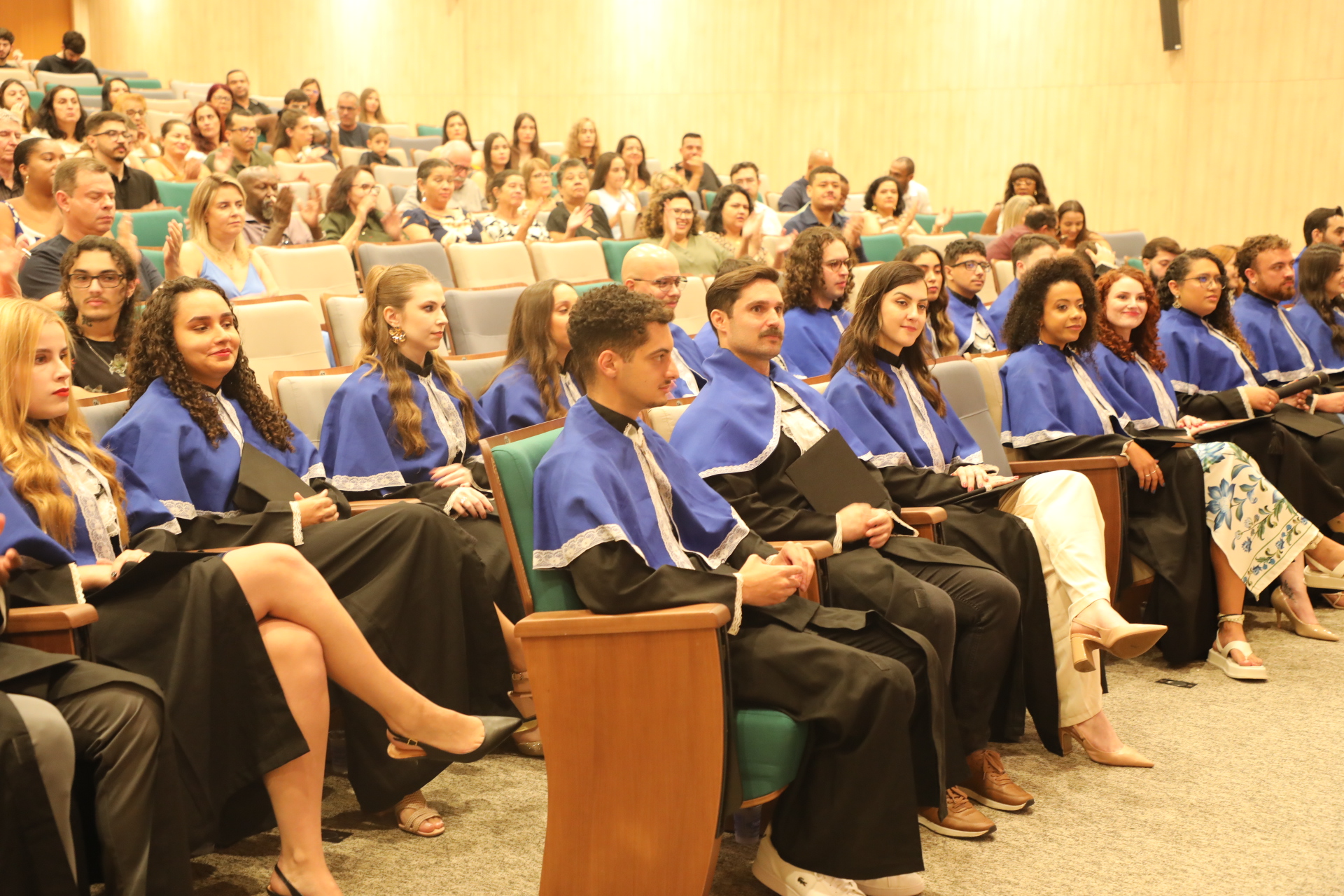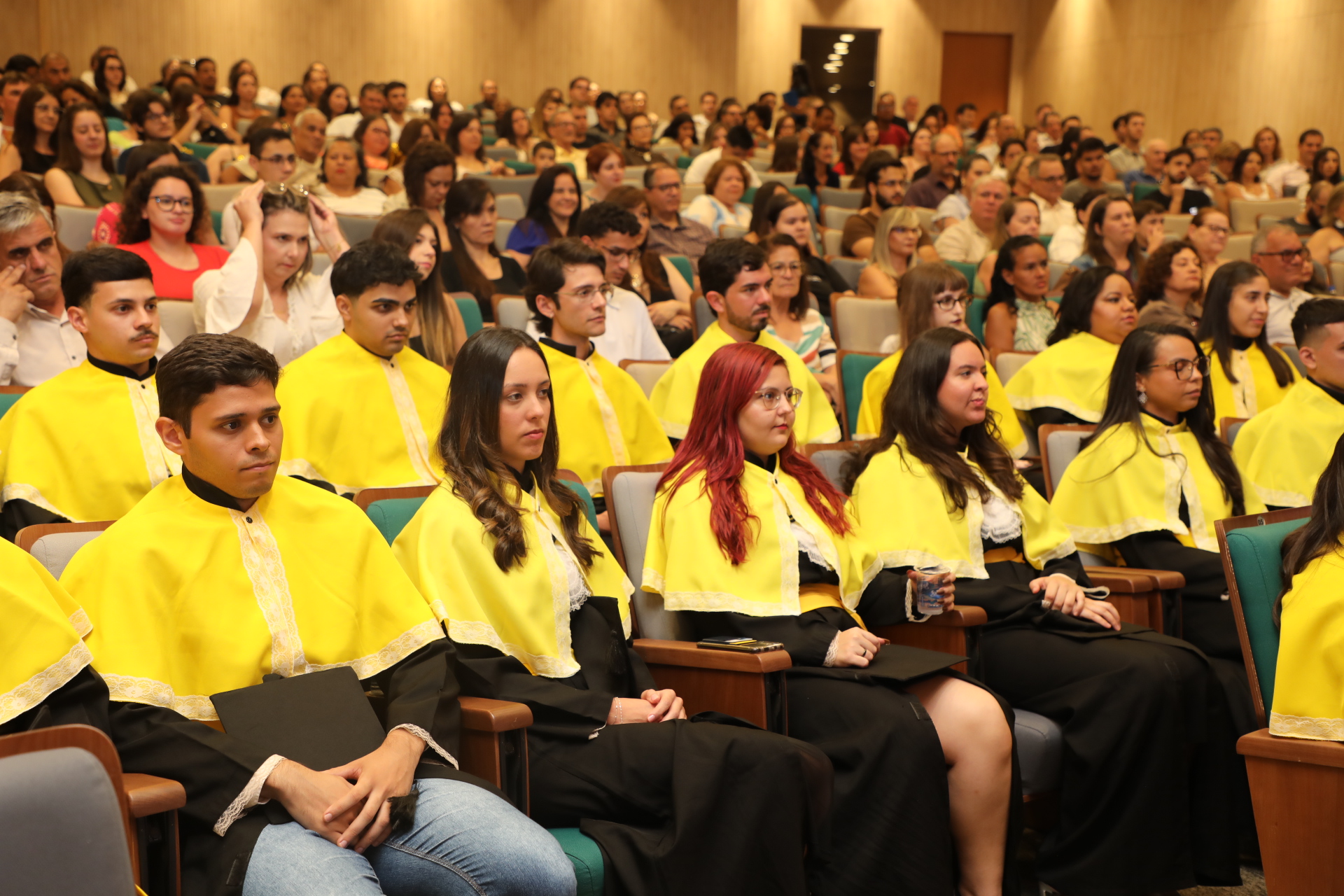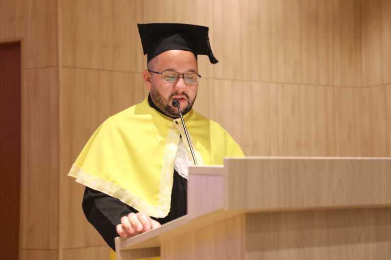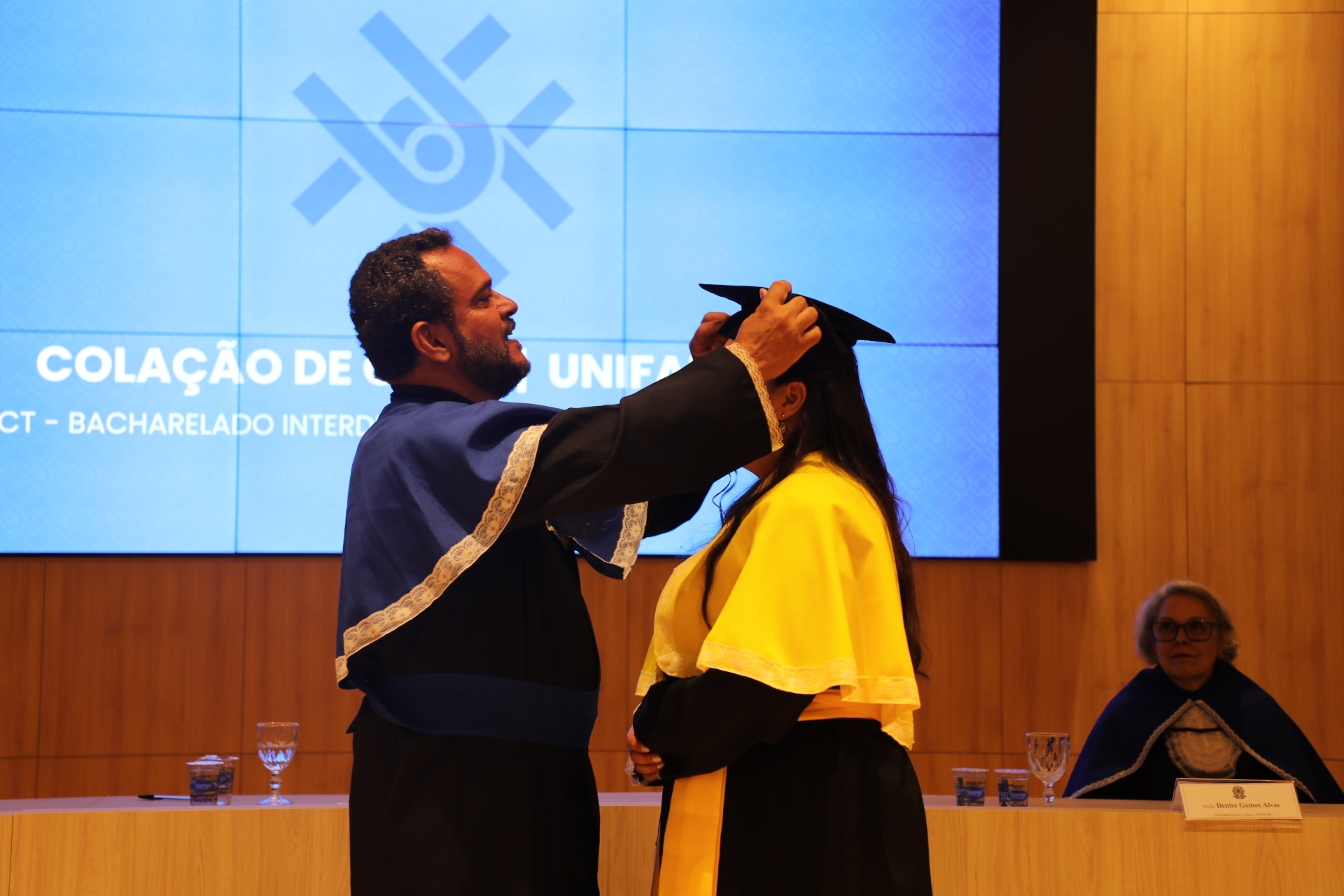 À tarde, a solenidade do Bacharelado Interdisciplinar em Ciência e Tecnologia (BICT) conferiu grau a 41 bacharéis. A juramentista Camila Helena do Carmo Tonon leu o juramento e a capelista Alana Farias Figueiredo representou a turma. O orador Gabriel Lucas Pereira Ramos lembrou que a formação em ciência e tecnologia é marcada por desafios e descobertas: “O ciclo básico nos ensinou a pensar, a questionar, a errar, a persistir e, sobretudo, a aprender”, afirmou. Ele relatou momentos emblemáticos – a temida ponte de macarrão, os relatórios em grupo, os seminários e o nervosismo das apresentações – e reconheceu o apoio mútuo entre colegas, especialmente durante a redação do Trabalho de Conclusão de Curso (TCC): “Quase sempre aparecia um amigo insistente, perguntando ‘E o TCC, como está?’, não para cobrar, mas para incentivar”. Gabriel incentivou os colegas a seguirem seus próprios ritmos e destacou: “Persistir é o que abre caminhos.”