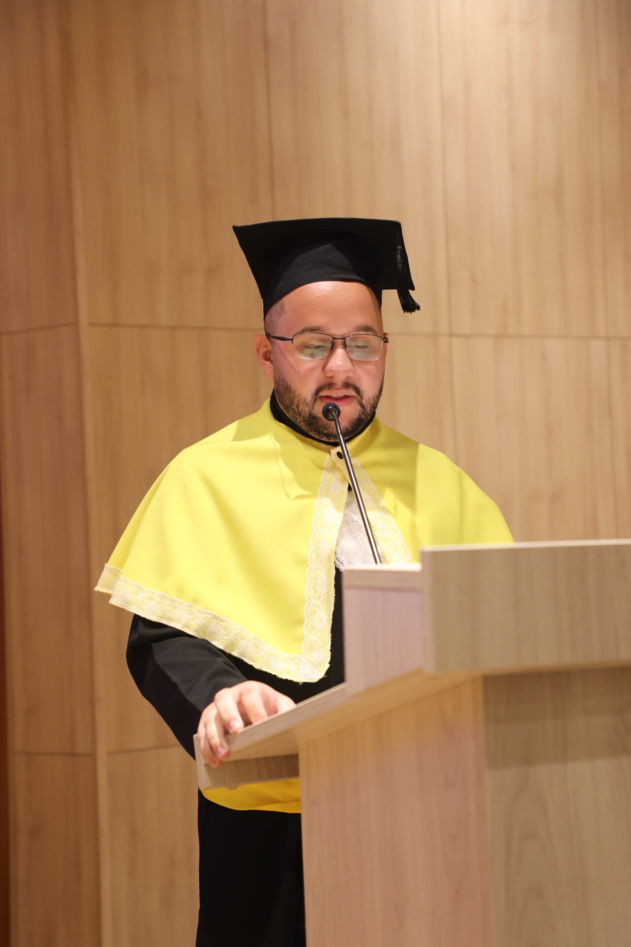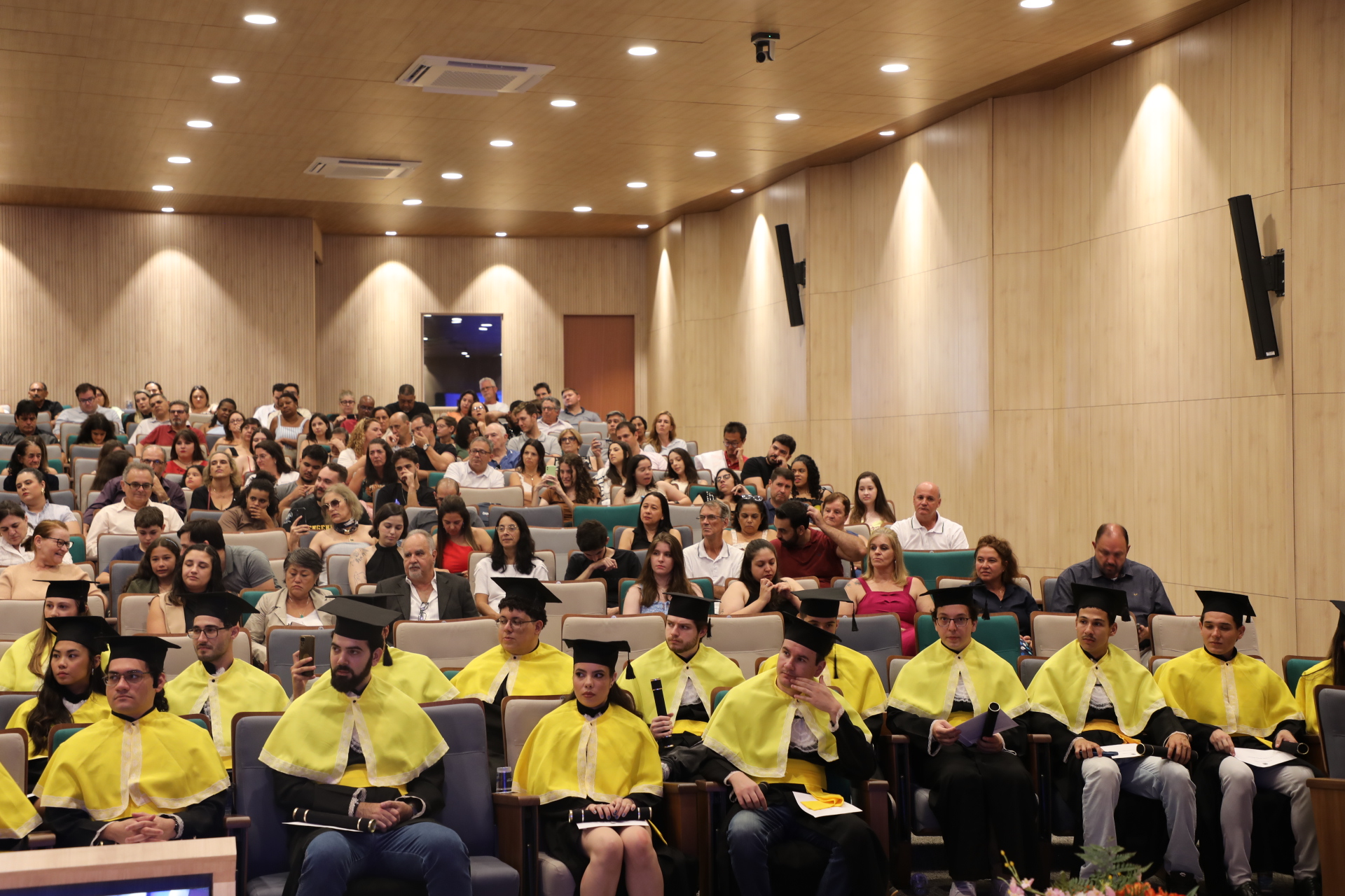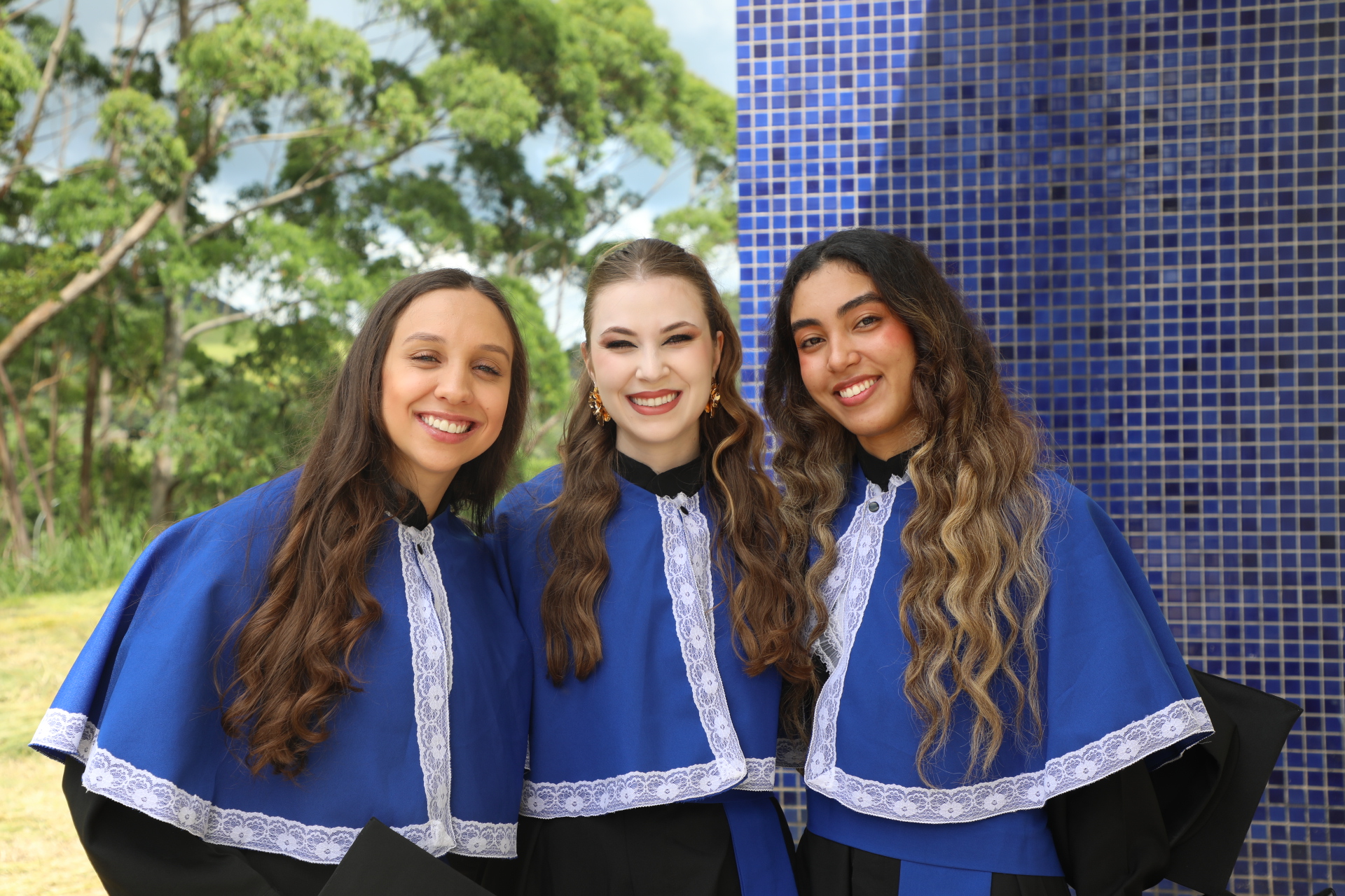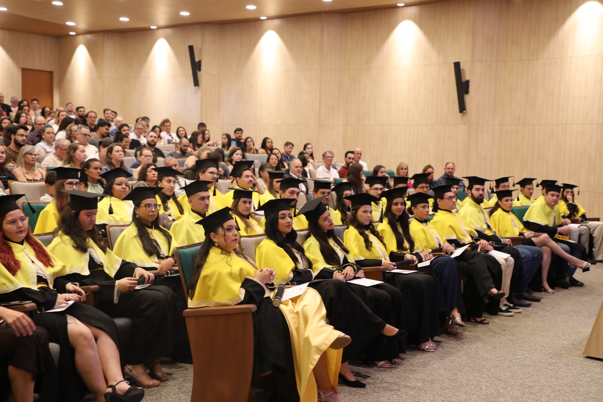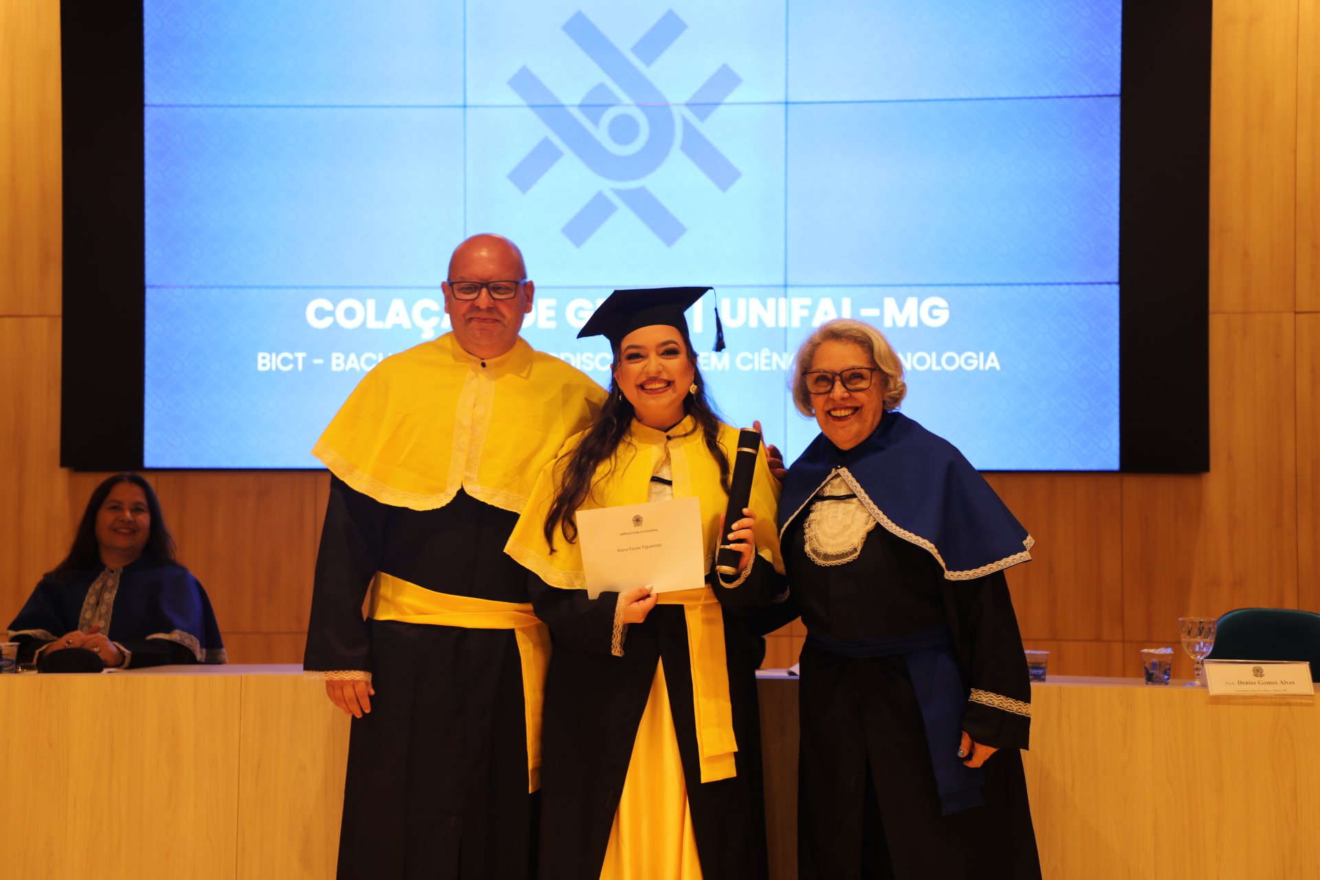 À tarde, a solenidade do Bacharelado Interdisciplinar em Ciência e Tecnologia (BICT) conferiu grau a 41 bacharéis. A juramentista Camila Helena do Carmo Tonon leu o juramento e a capelista Alana Farias Figueiredo representou a turma. O orador Gabriel Lucas Pereira Ramos lembrou que a formação em ciência e tecnologia é marcada por desafios e descobertas: “O ciclo básico nos ensinou a pensar, a questionar, a errar, a persistir e, sobretudo, a aprender”, afirmou. Ele relatou momentos emblemáticos – a temida ponte de macarrão, os relatórios em grupo, os seminários e o nervosismo das apresentações – e reconheceu o apoio mútuo entre colegas, especialmente durante a redação do Trabalho de Conclusão de Curso (TCC): “Quase sempre aparecia um amigo insistente, perguntando ‘E o TCC, como está?’, não para cobrar, mas para incentivar”. Gabriel incentivou os colegas a seguirem seus próprios ritmos e destacou: “Persistir é o que abre caminhos.”
