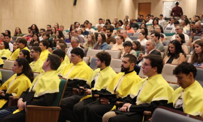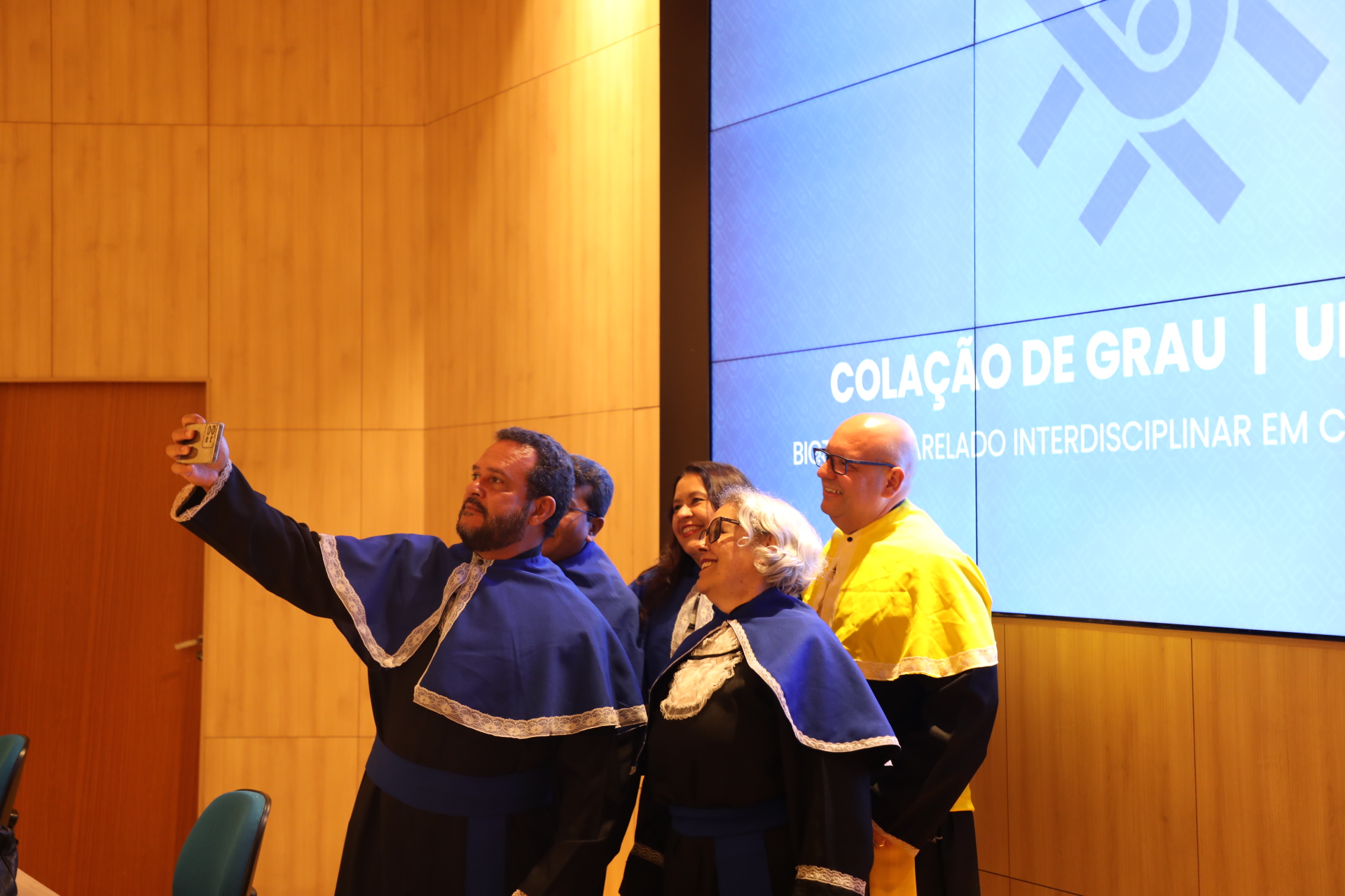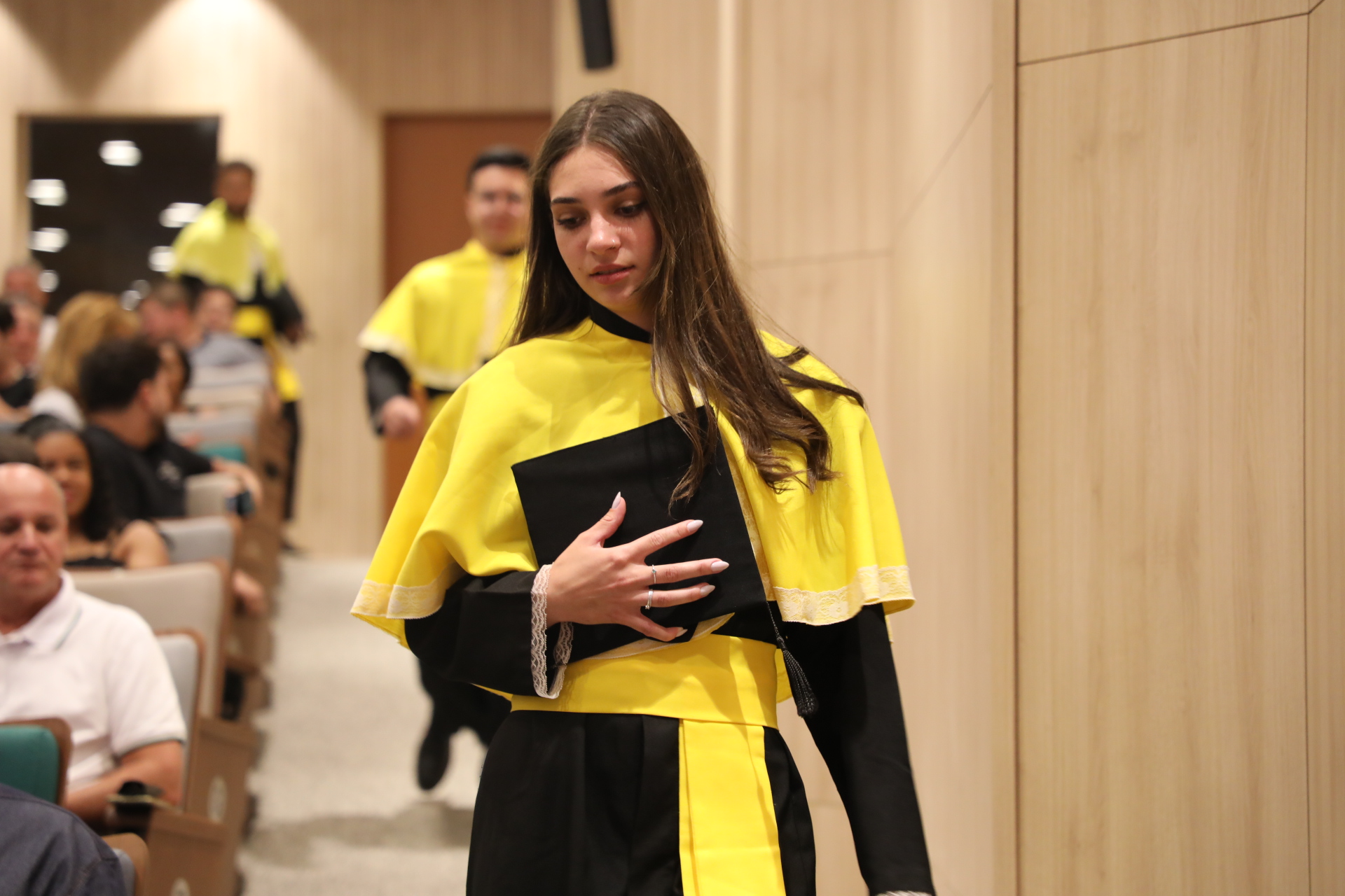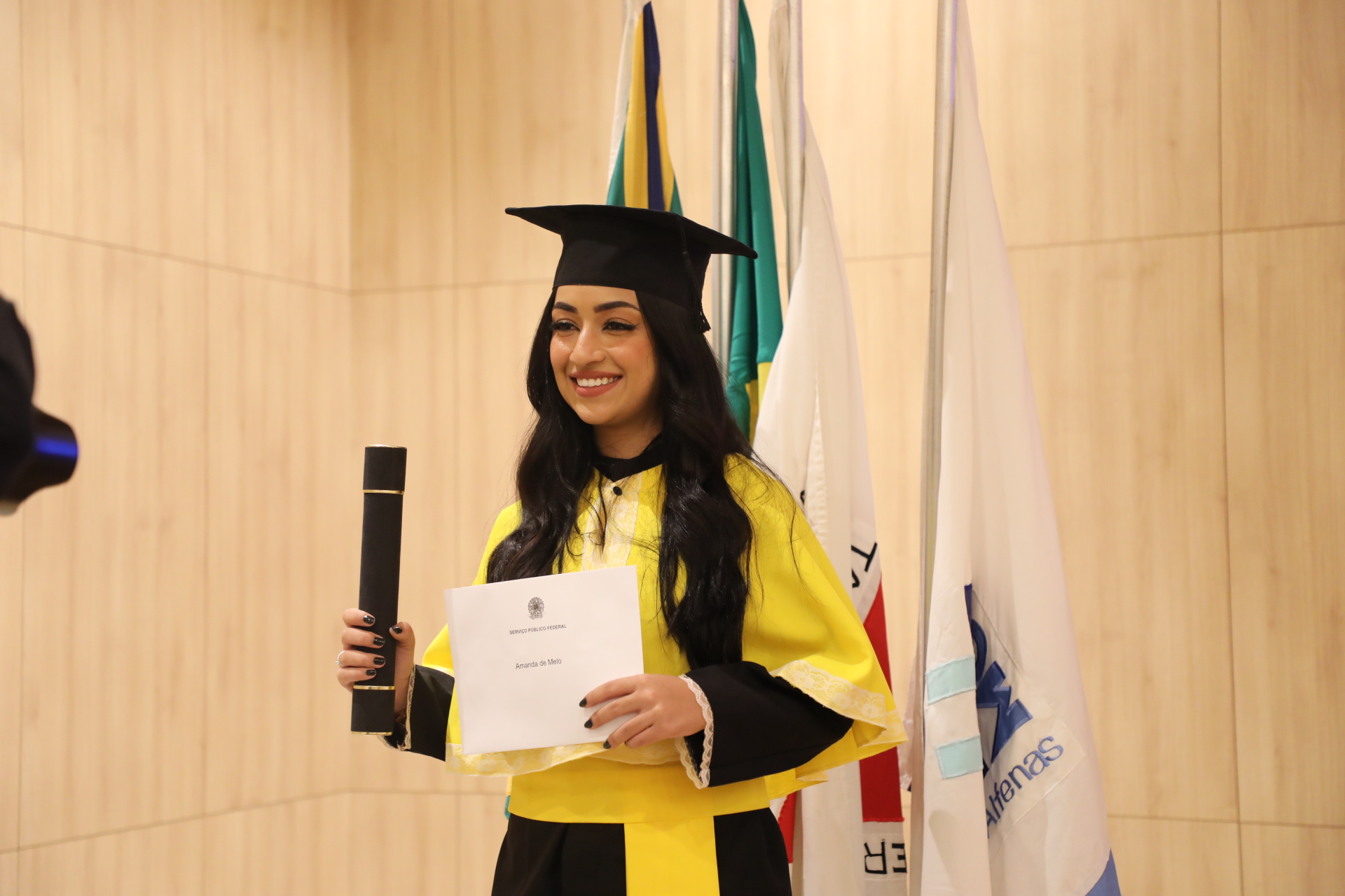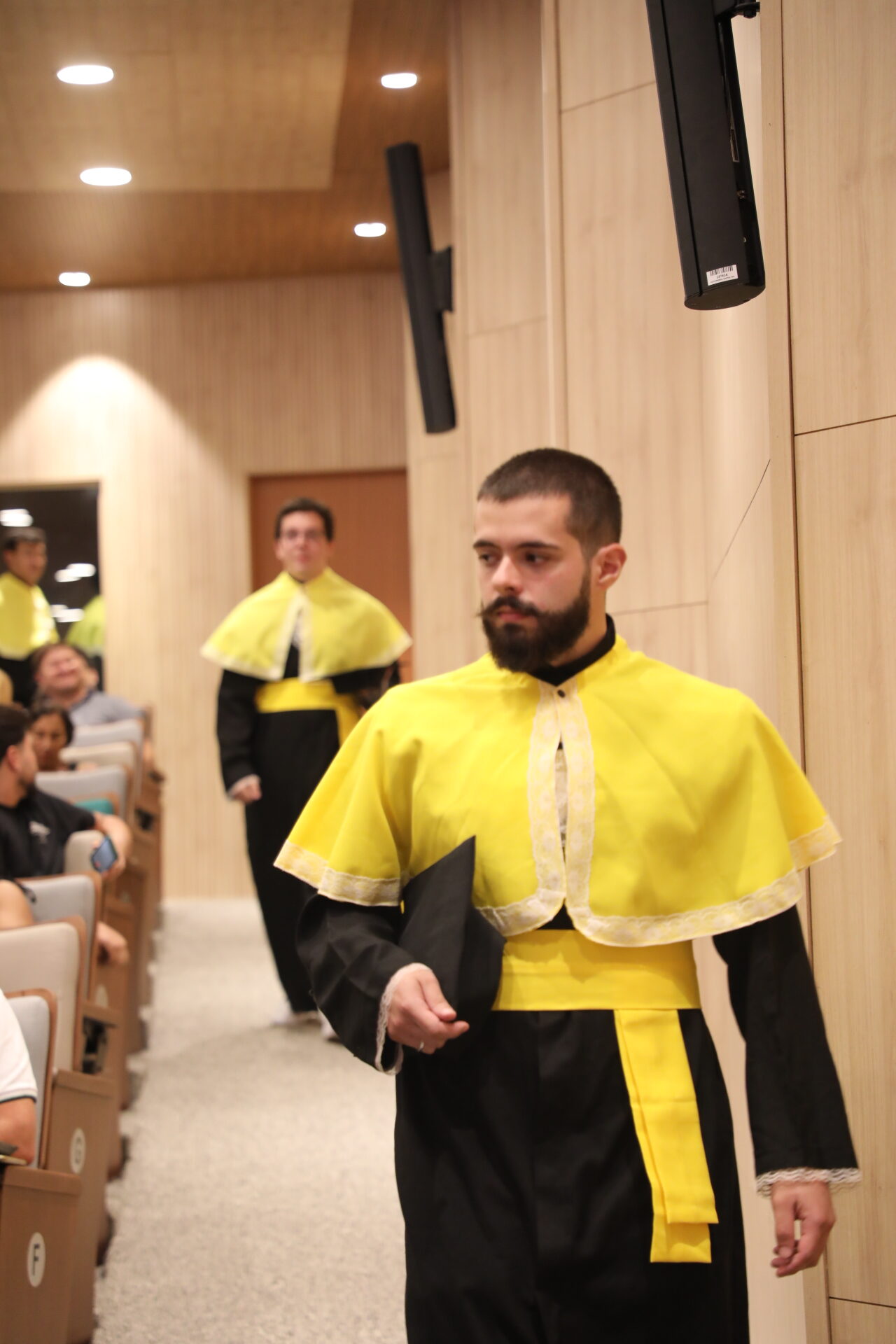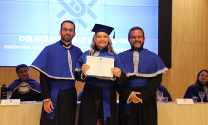 À tarde, a solenidade do Bacharelado Interdisciplinar em Ciência e Tecnologia (BICT) conferiu grau a 41 bacharéis. A juramentista Camila Helena do Carmo Tonon leu o juramento e a capelista Alana Farias Figueiredo representou a turma. O orador Gabriel Lucas Pereira Ramos lembrou que a formação em ciência e tecnologia é marcada por desafios e descobertas: “O ciclo básico nos ensinou a pensar, a questionar, a errar, a persistir e, sobretudo, a aprender”, afirmou. Ele relatou momentos emblemáticos – a temida ponte de macarrão, os relatórios em grupo, os seminários e o nervosismo das apresentações – e reconheceu o apoio mútuo entre colegas, especialmente durante a redação do Trabalho de Conclusão de Curso (TCC): “Quase sempre aparecia um amigo insistente, perguntando ‘E o TCC, como está?’, não para cobrar, mas para incentivar”. Gabriel incentivou os colegas a seguirem seus próprios ritmos e destacou: “Persistir é o que abre caminhos.”