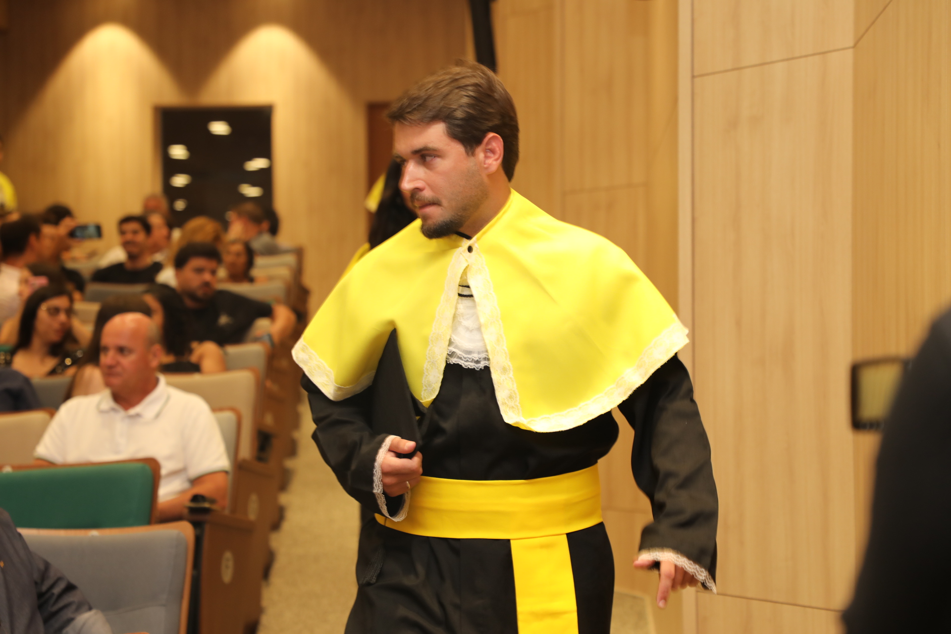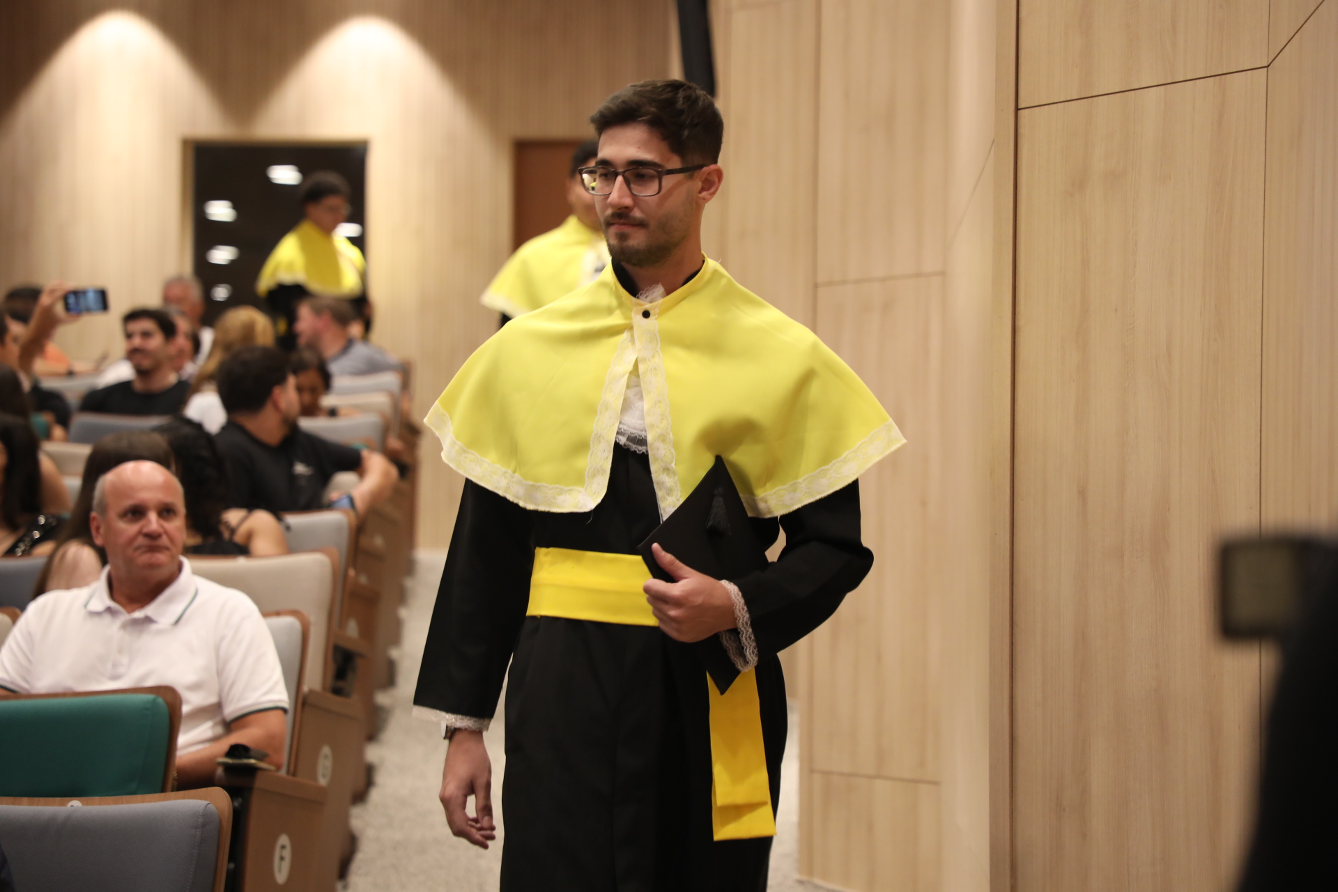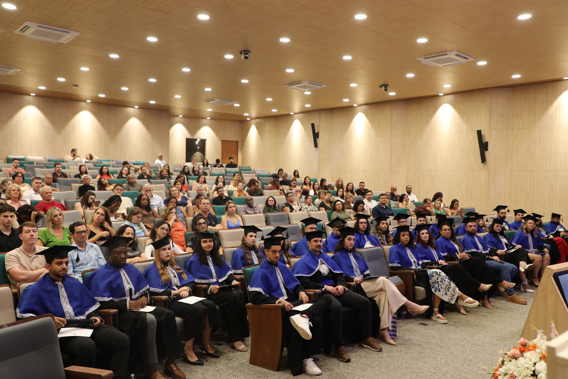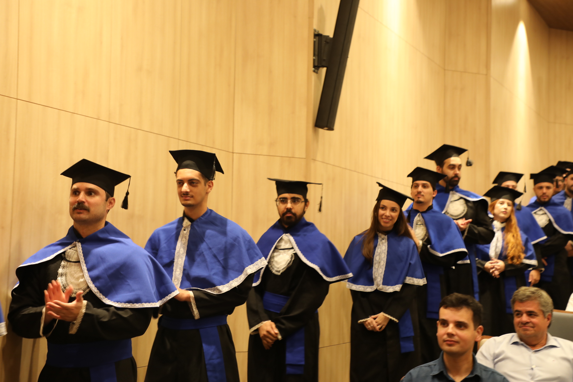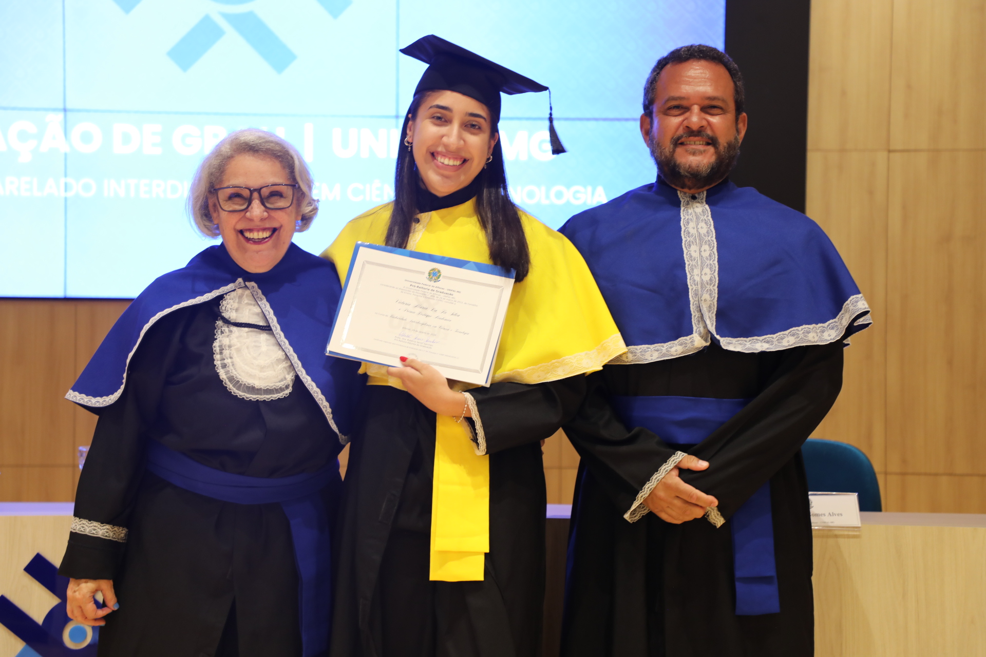 À tarde, a solenidade do Bacharelado Interdisciplinar em Ciência e Tecnologia (BICT) conferiu grau a 41 bacharéis. A juramentista Camila Helena do Carmo Tonon leu o juramento e a capelista Alana Farias Figueiredo representou a turma. O orador Gabriel Lucas Pereira Ramos lembrou que a formação em ciência e tecnologia é marcada por desafios e descobertas: “O ciclo básico nos ensinou a pensar, a questionar, a errar, a persistir e, sobretudo, a aprender”, afirmou. Ele relatou momentos emblemáticos – a temida ponte de macarrão, os relatórios em grupo, os seminários e o nervosismo das apresentações – e reconheceu o apoio mútuo entre colegas, especialmente durante a redação do Trabalho de Conclusão de Curso (TCC): “Quase sempre aparecia um amigo insistente, perguntando ‘E o TCC, como está?’, não para cobrar, mas para incentivar”. Gabriel incentivou os colegas a seguirem seus próprios ritmos e destacou: “Persistir é o que abre caminhos.”