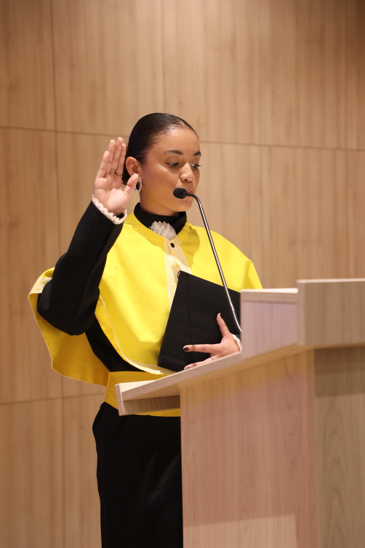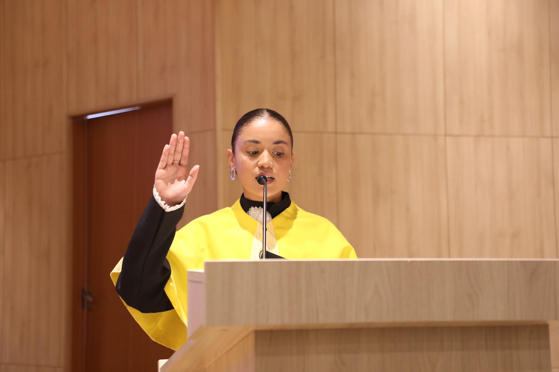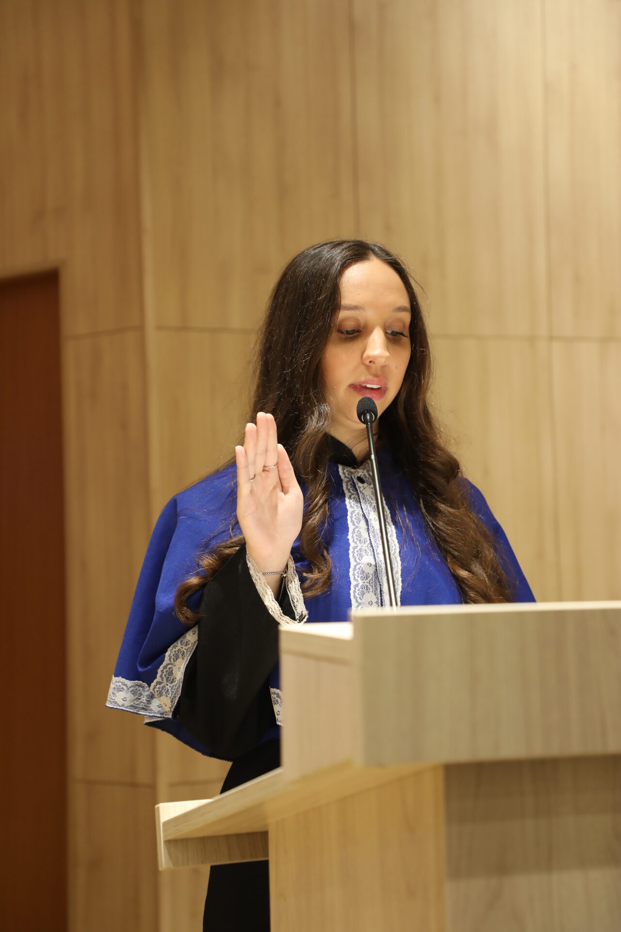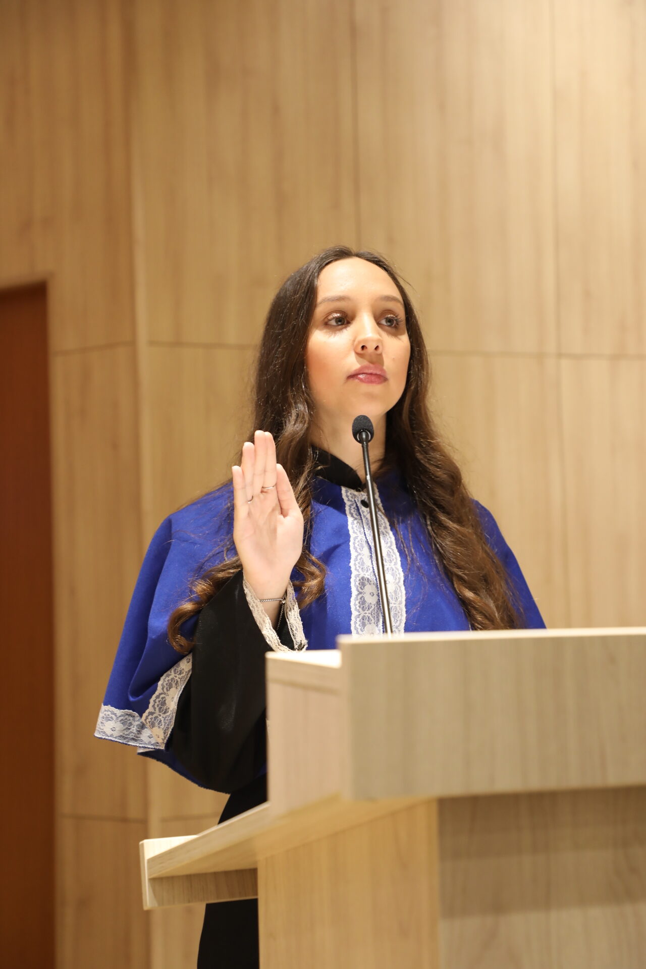 À tarde, a solenidade do Bacharelado Interdisciplinar em Ciência e Tecnologia (BICT) conferiu grau a 41 bacharéis. A juramentista Camila Helena do Carmo Tonon leu o juramento e a capelista Alana Farias Figueiredo representou a turma. O orador Gabriel Lucas Pereira Ramos lembrou que a formação em ciência e tecnologia é marcada por desafios e descobertas: “O ciclo básico nos ensinou a pensar, a questionar, a errar, a persistir e, sobretudo, a aprender”, afirmou. Ele relatou momentos emblemáticos – a temida ponte de macarrão, os relatórios em grupo, os seminários e o nervosismo das apresentações – e reconheceu o apoio mútuo entre colegas, especialmente durante a redação do Trabalho de Conclusão de Curso (TCC): “Quase sempre aparecia um amigo insistente, perguntando ‘E o TCC, como está?’, não para cobrar, mas para incentivar”. Gabriel incentivou os colegas a seguirem seus próprios ritmos e destacou: “Persistir é o que abre caminhos.”