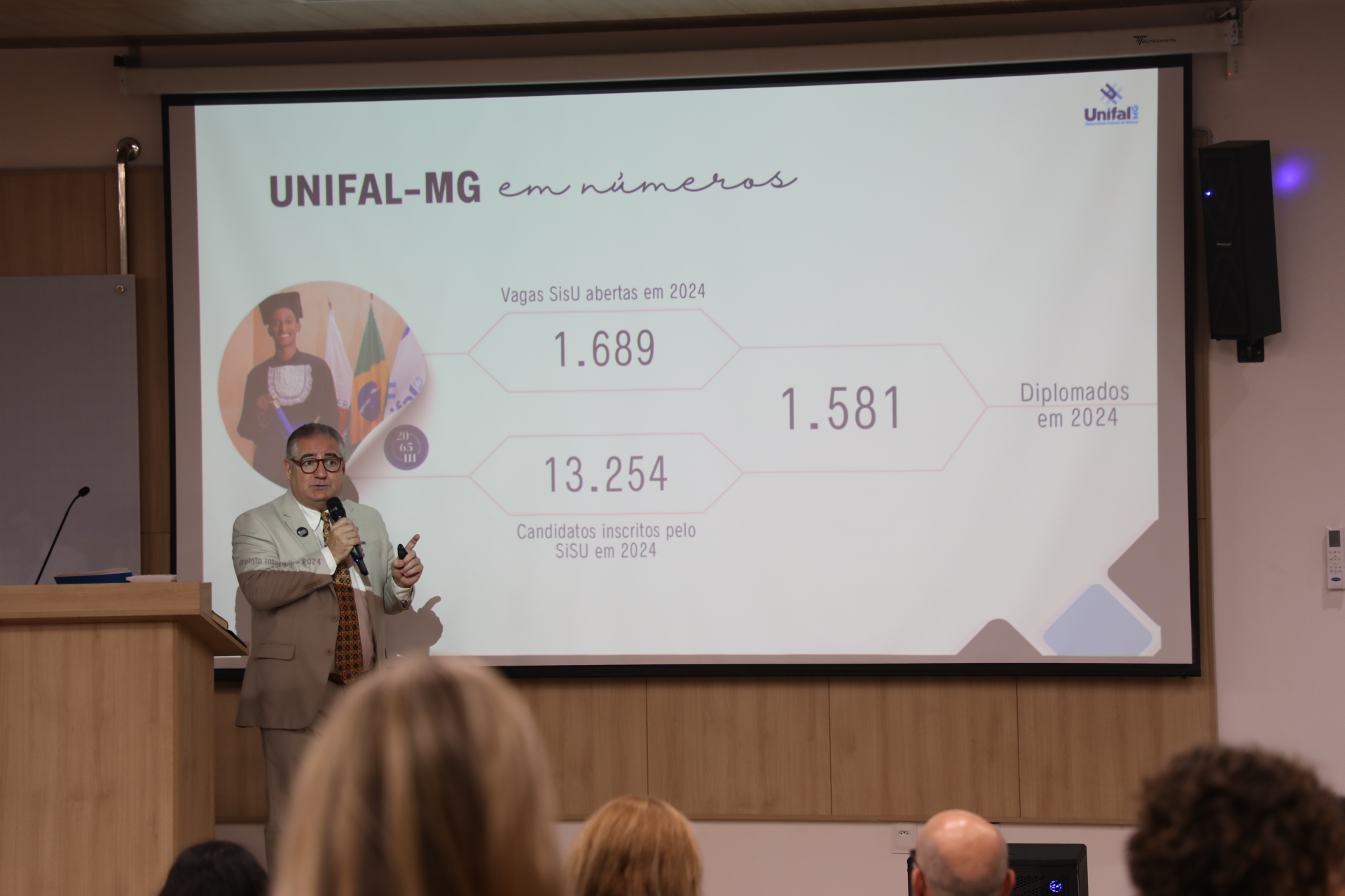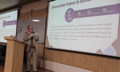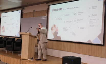 Após a abertura, o reitor apresentou um panorama detalhado da UNIFAL-MG, que neste ano de 2025 celebra 20 anos de transformação em Universidade Federal, além de 111 anos de história e 60 de federalização.
