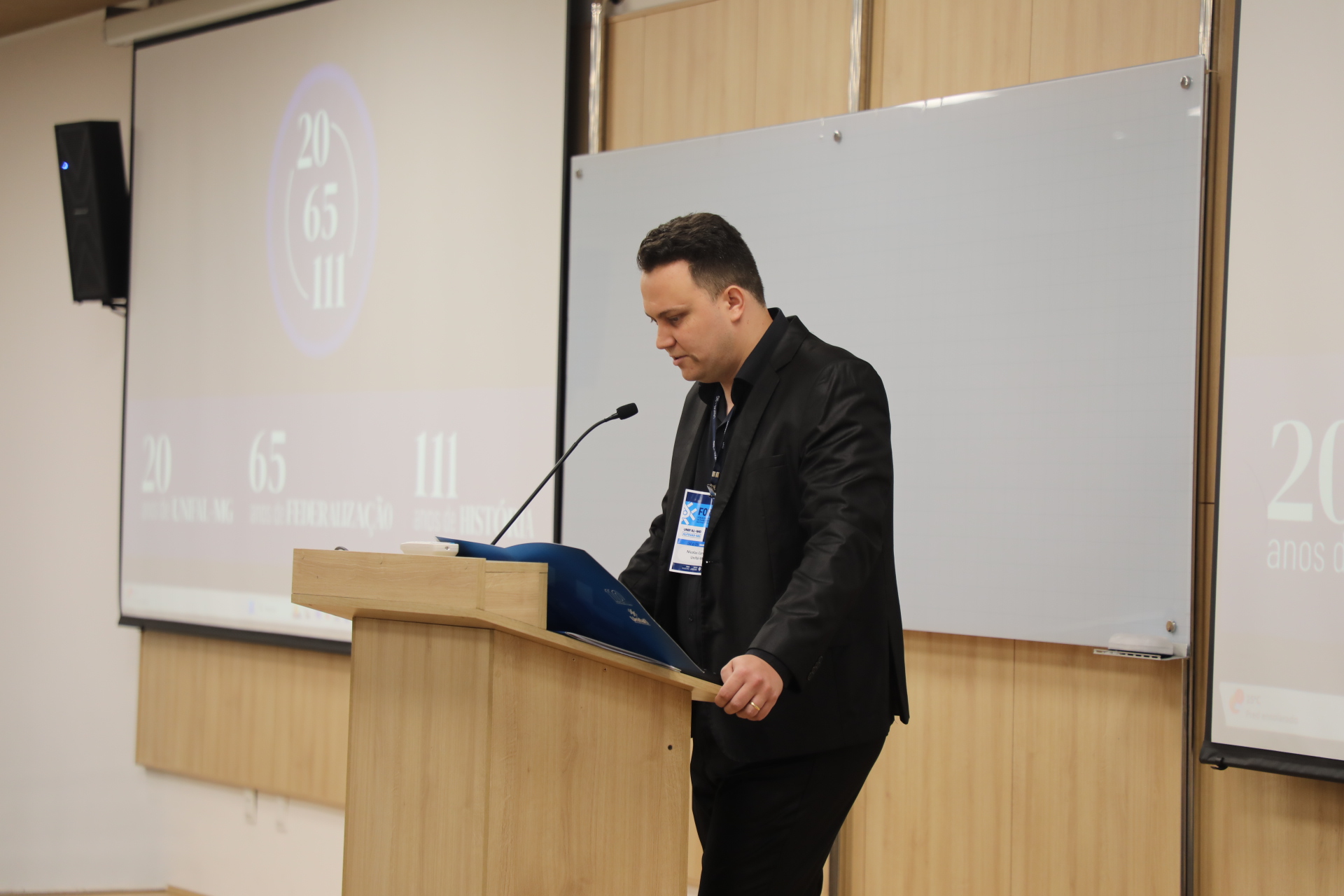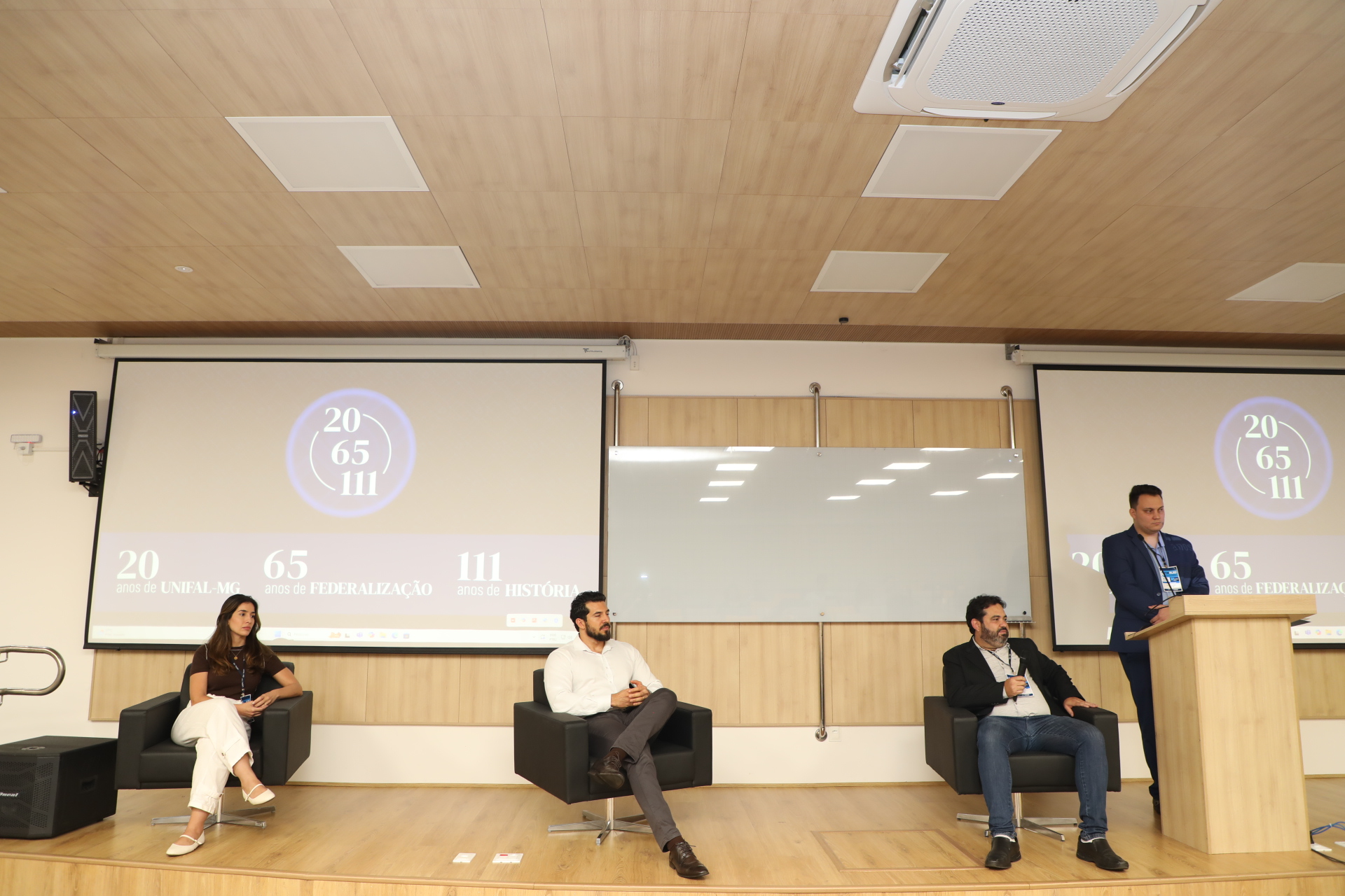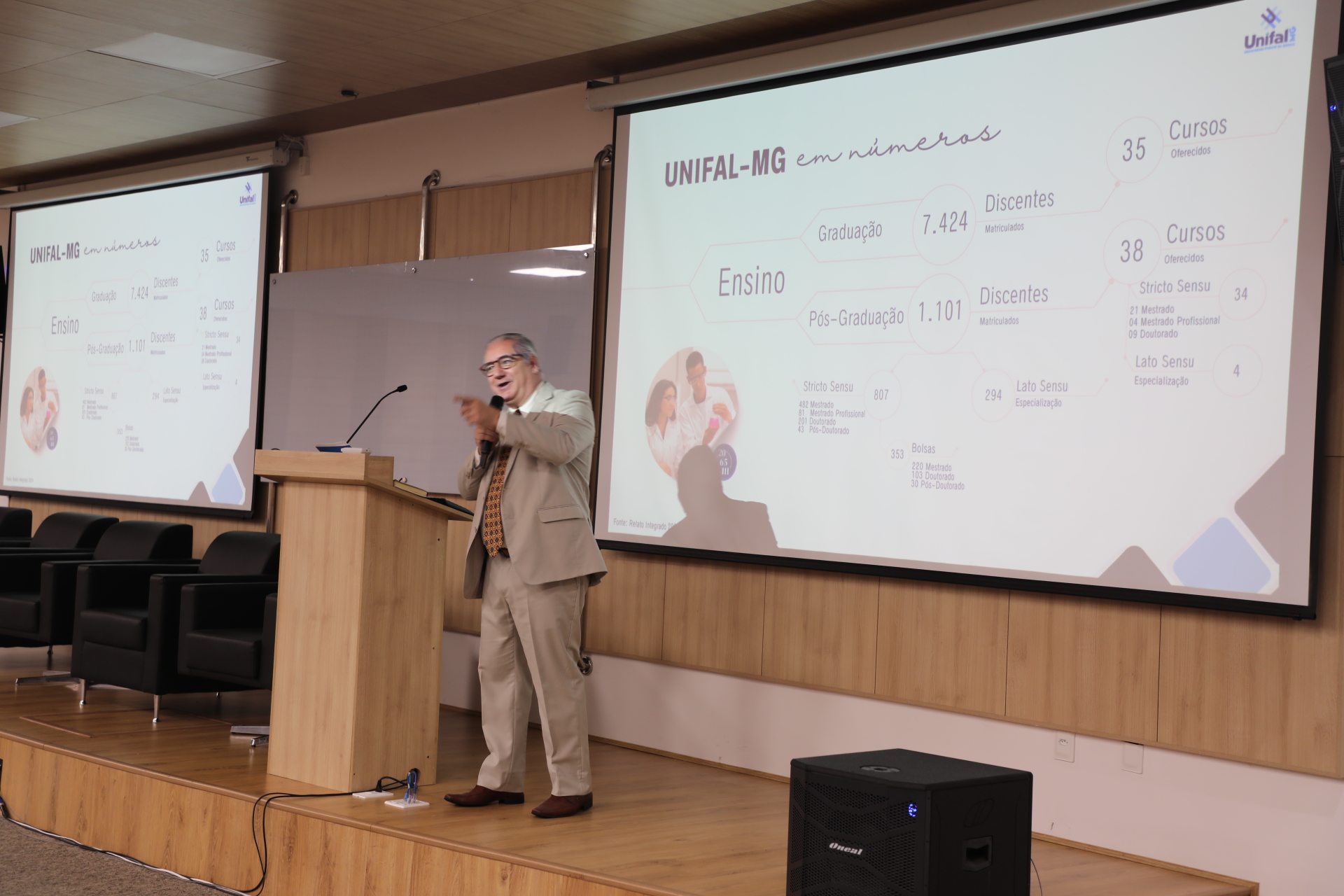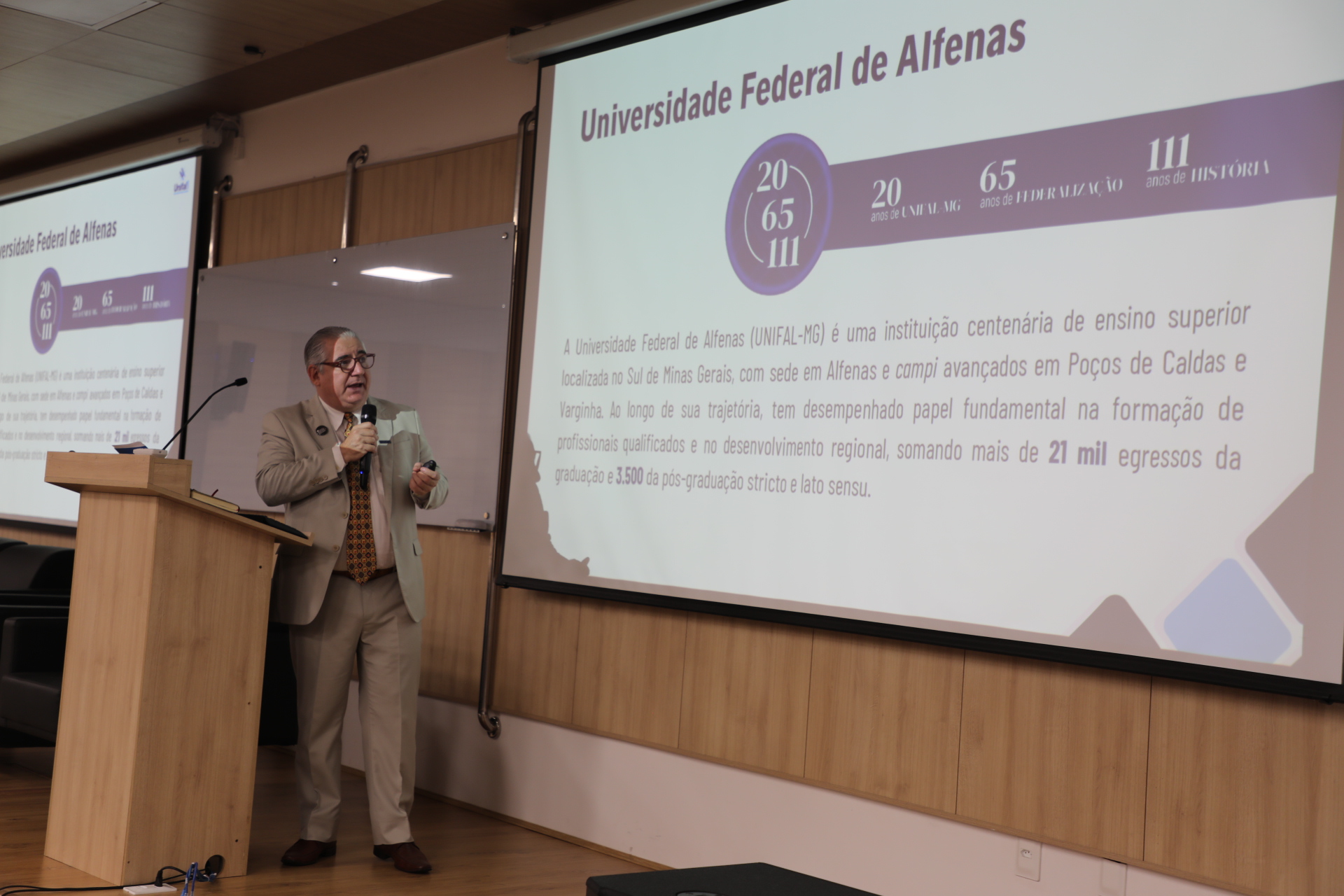 Após a abertura, o reitor apresentou um panorama detalhado da UNIFAL-MG, que neste ano de 2025 celebra 20 anos de transformação em Universidade Federal, além de 111 anos de história e 60 de federalização.
