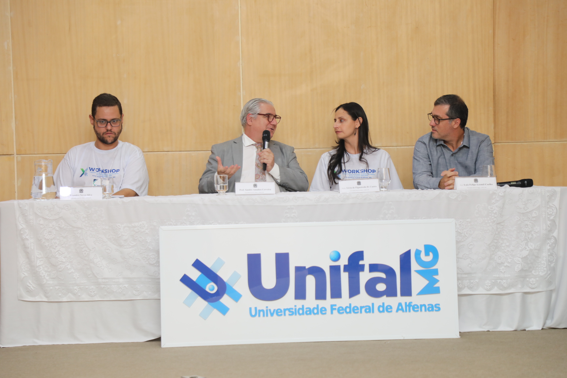 A mesa de abertura foi composta, da esquerda para a direita, por Evandro Neves Silva, discente responsável pelo evento; Sandro Amadeu cerveira, reitor da UNIFAL-MG; Livia de Figueiredo Diniz Castro, do ICB da Universidade; e Luiz Felipe Leomil Coelho, também do ICB. (Foto: Dicom/UNIFAL-MG)