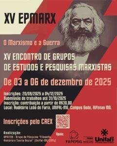 O GPHiTeS – Grupo de Pesquisa “Filosofia, História e Teoria Social” (UNIFAL-MG/CNPq) realiza, entre os dias 03 e 06/12, o 15º Encontro de Grupos de Estudos e Pesquisas Marxistas (EPMARX). O evento faz parte das ações de extensão da Universidade e conta com o apoio da Fundação de Amparo à Pesquisa do Estado de Minas Gerais (Fapemig).