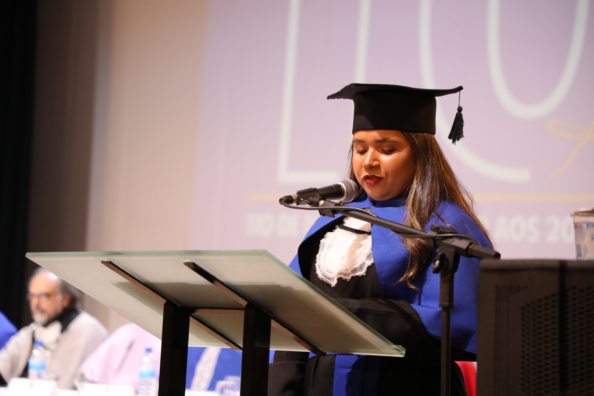 A oradora da turma foi a economista Bruna Ferreira Alves, que relembrou o caminho percorrido pelos profissionais, do início da graduação à formatura, agradecendo a UNIFAL-MG pela oportunidade de formação: “deixamos um pouco de nós aqui, mas levamos muito da Unifal em nossos corações, não apenas como um status ou diploma, mas como a essência de quem somos e de como iremos ocupar nossos espaços no mundo a partir de agora”.
